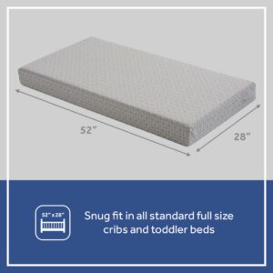 – SNUG FIT IN CRIBS AND TODDLER BEDS: Safely unroll and allow the mattress to expand to 52 x 28 inches to create a perfect fit inside any standard full-size crib and toddler bed. Passes ASTM Crib Mattress Standards!