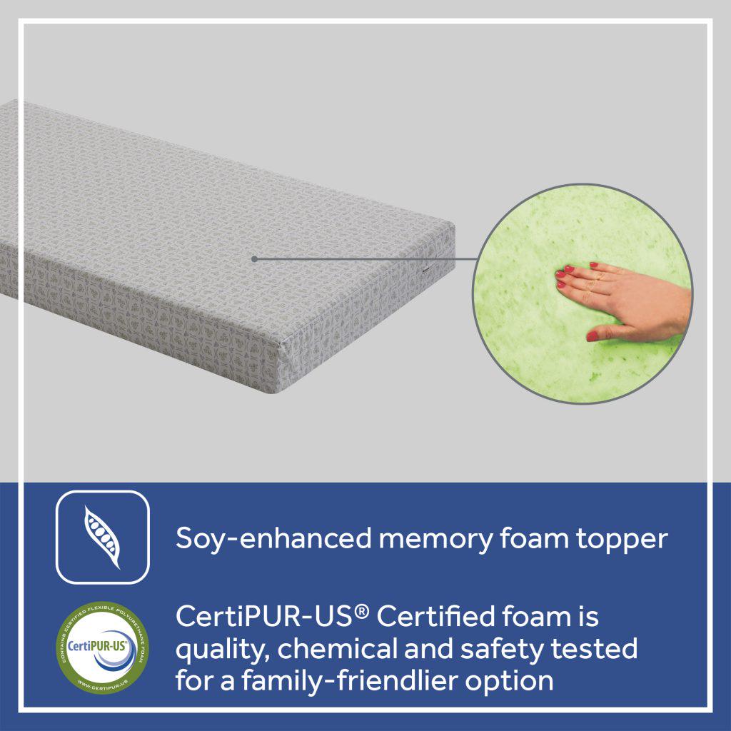 – 2-STAGE INFANT & TODDLER GROW-WITH-ME DESIGN: A firmer infant high-density foam side (identified on the foam) and a more comfortable soybean memory foam side for optimal coziness for toddlers.