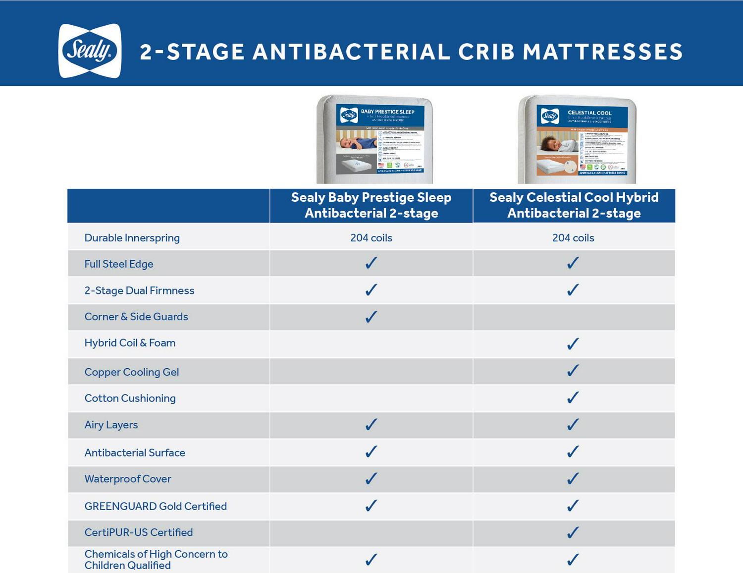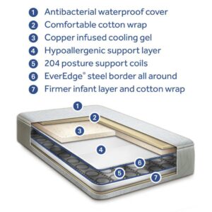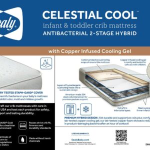 The Sealy Celestial Cool Antibacterial 2-Stage Hybrid Infant & Toddler Crib Mattress combines innovative copper cooling gel and firm posture support coils. Copper foam uses natural copper elements that helps create a cooler foam compared to regular memory foam toppers. Laboratory tests showed our copper foam showed a reduction in product-damaging bacteria after an hour of contact. 204 American-made springs are tested for lasting durability and resiliency. Secure steel edges support babies throughout the surface. A lab-tested, EPA-approved Staph-Gard antibacterial cover helps eliminate harmful bacteria on baby’s mattress. The cover is 100% waterproof, stain-resistant and wipe clean. Lock-stitched waterproof binding and an airflow pocket is designed to help keep the mattress fresh. Sealy crib mattresses are GREENGUARD GOLD Air Quality Certified for a healthier indoor environment. Fits snugly inside all US standard-size cribs and toddler beds. Passes ASTM crib mattress standards for non-toxic for babies made without phthalates, lead and passes ASTM standards. Measured to fit all US standard full-size cribs and toddler beds. Premium support, comfort and lasting durability. More babies sleep on a Sealy than any other brand.