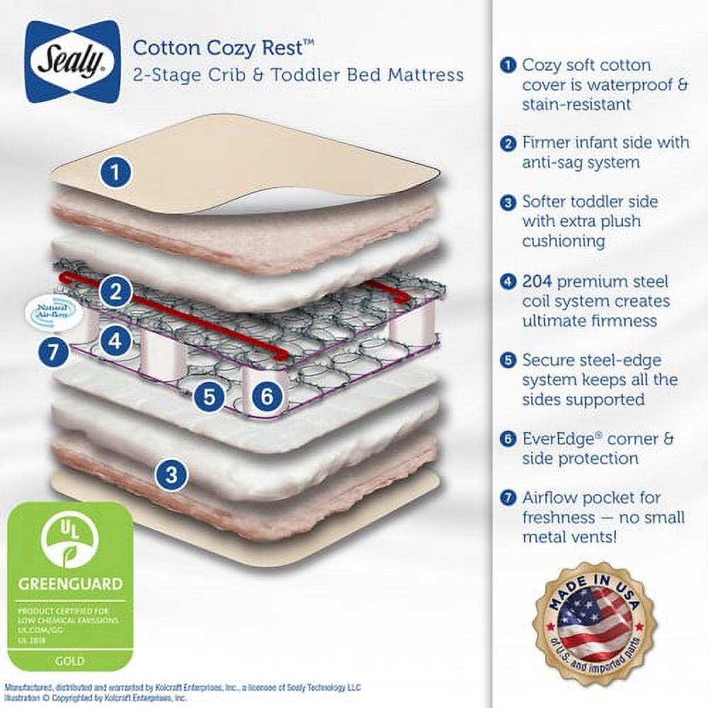 The Sealy Cotton Cozy Rest crib mattress offer two-stage dual firmness that grows with babies through the toddler years. The mattress has a firmer infant side plus a softer toddler side of cotton and hypoallergenic cushioning. The core is sturdy with a premium posture supportive 204 interwoven steel coil system that is firm, durable and supportive for a lifetime. The full perimeter steel frame supports the entire edge system plus corners and sides are protected by the EverEdge strength pillars. An anti-sag weight distribution frame keeps infants supported. A luxurious cotton cover is natural, breathable, PVC-free and easy-clean. The cover is enhanced with a waterproof and stain-resistant coating to help prevent allergens, mold and odors from spreading.