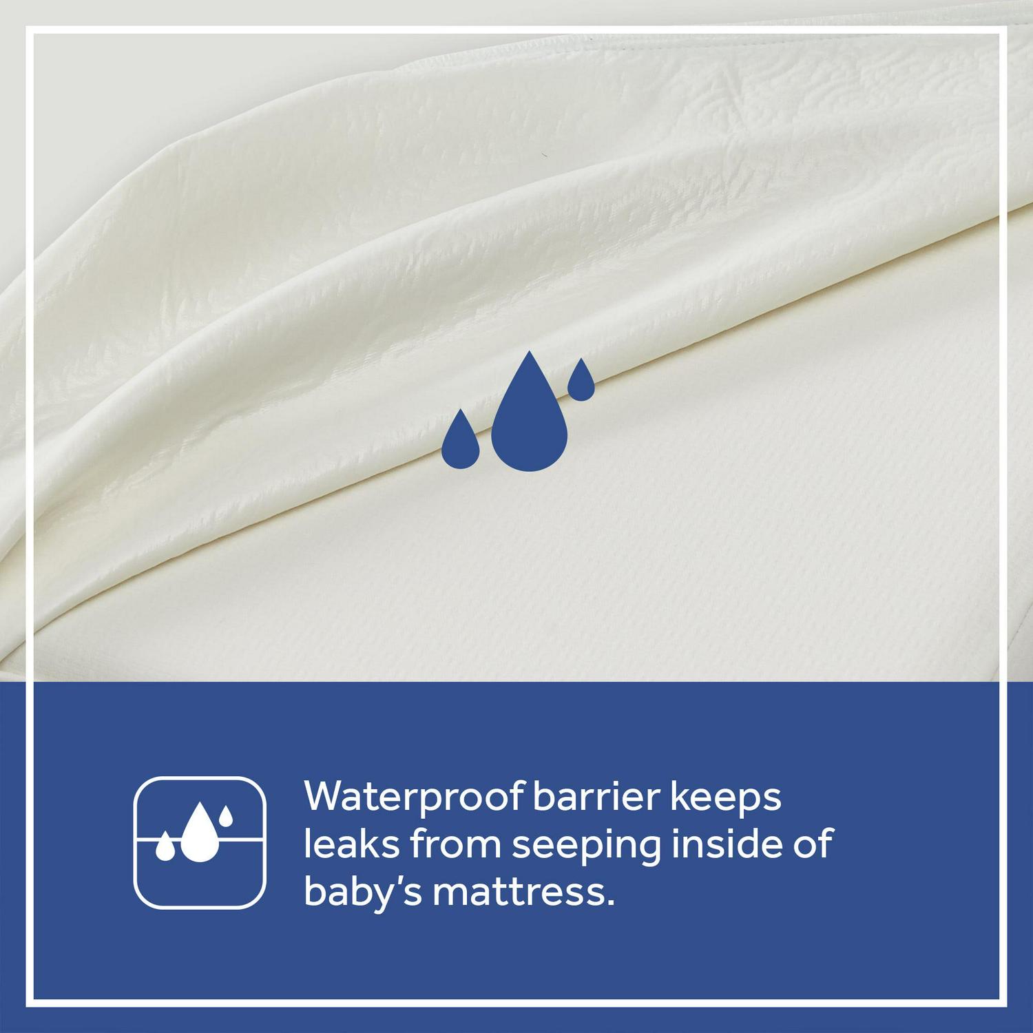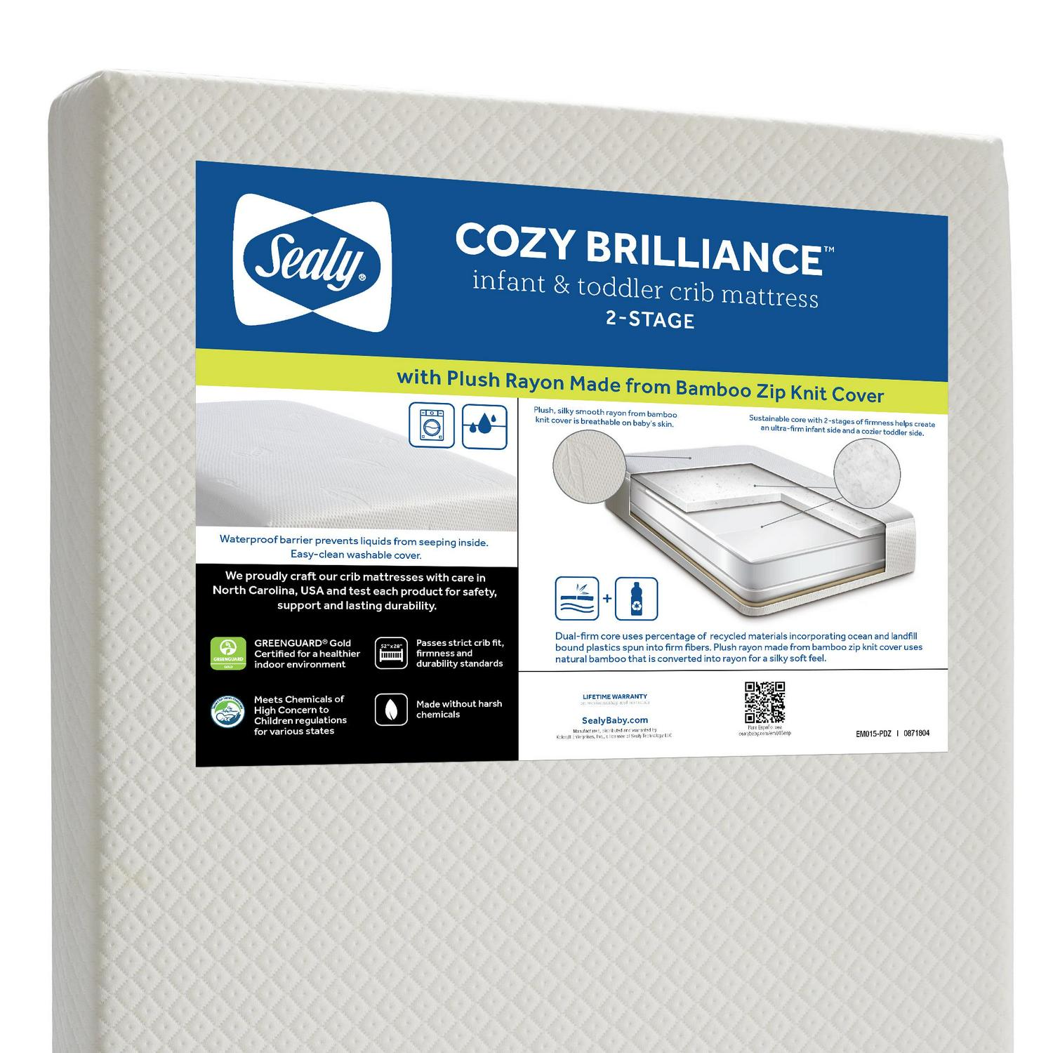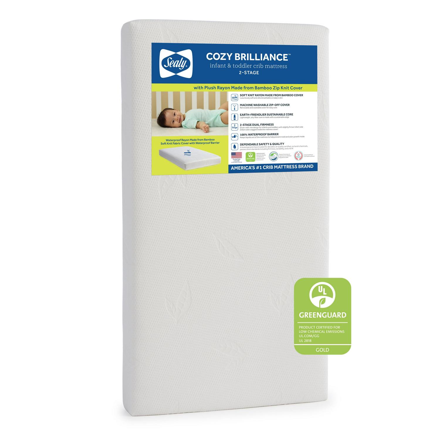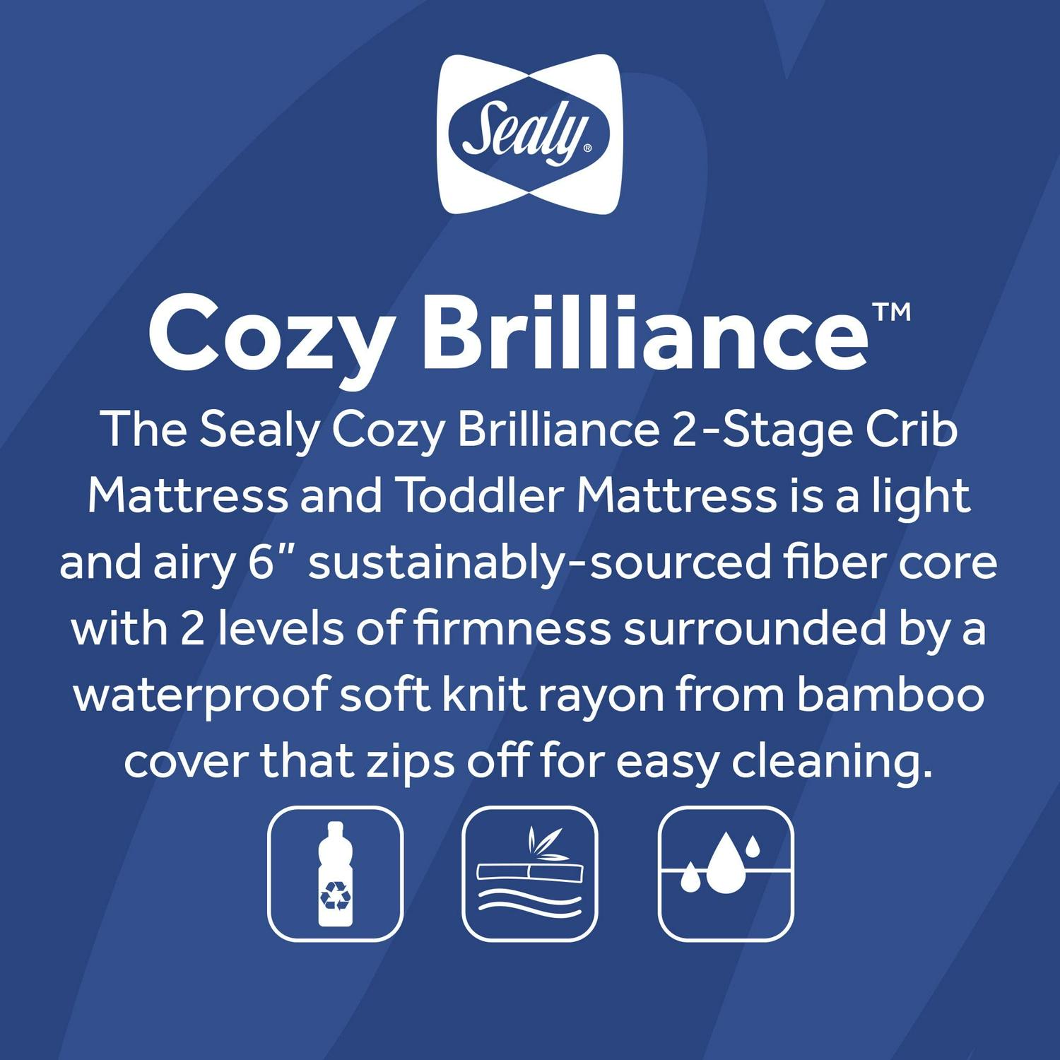 The Sealy Cozy Brilliance 2-Stage Crib Mattress and Toddler Mattress is a lightweight, sustainable design that includes a soft, breathable rayon from bamboo zip knit cover. The grow-with-me supportive core includes a very firm infant side and a cozier toddler side entirely made with Earth-friendlier sustainable fiber. The rayon from bamboo cover is soft, silky and breathable on baby’s skin. Zip-off cover for easy machine wash. Essential waterproof barrier keeps liquids from seeping inside baby’s mattress. Measures 52 inches long x 28 inches wide x 6 inches thick and provides a secure fit in U.S. standard size cribs and toddler beds. All Sealy baby crib mattresses are GREENGUARD GOLD Air Quality Certified for a healthier indoor environment. Square corners for a snug fit. Weighs less than 8 pounds to easily lift and change crib sheets. Gentle on baby, no polyurethane foam, latex or fiberglass materials. Meets ASTM Crib Mattress standards for safety, quality and lasting durability. Lifetime warranty on workmanship and materials.