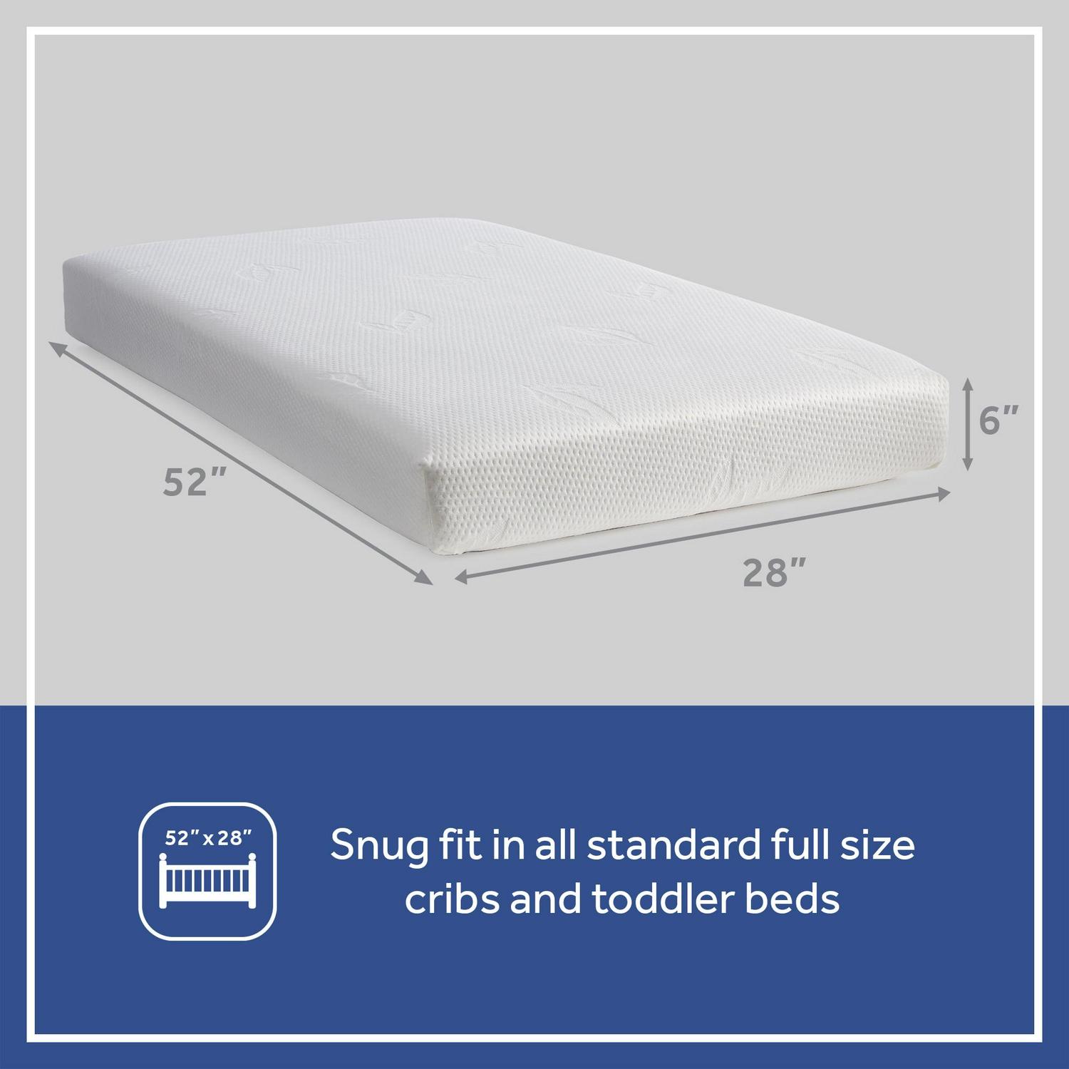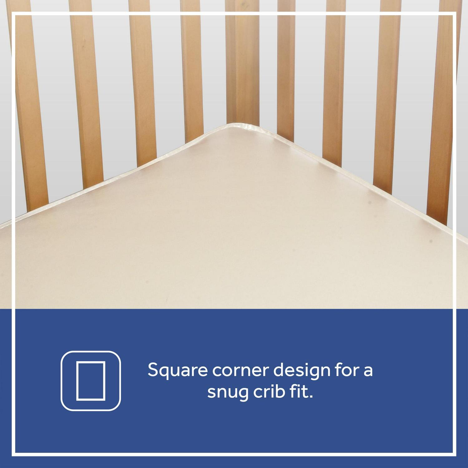 – PERFECTLY SNUG FIT: Passes ASTM Crib Mattress standards including firmness and crib fit testing to properly fit all standard size cribs and toddler beds. Measures 52″ L x 28″ W x 6″ thick and square corner design fits corners snugly
