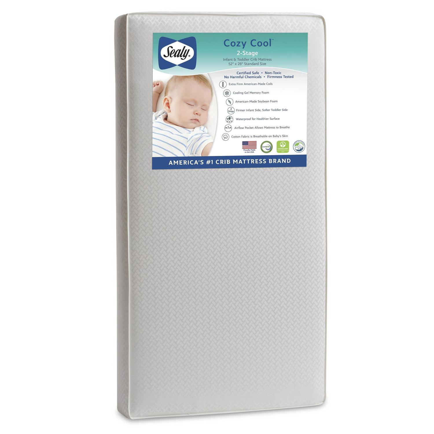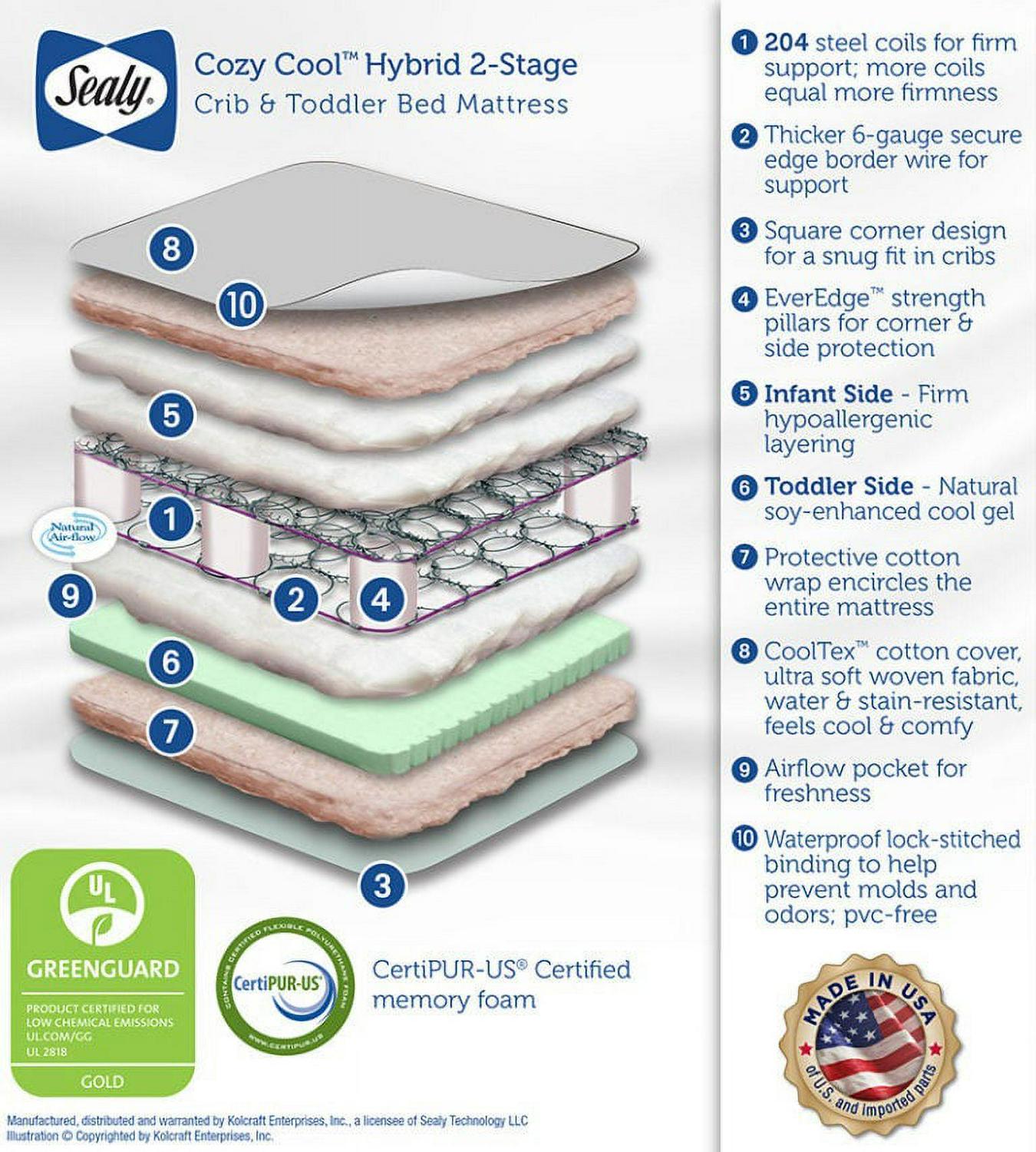 The Sealy Cozy Cool 2-Stage Hybrid Crib Mattress and Toddler mattress is a premium baby mattress that combines both coils and cool gel foam. Expertly made durable 204 innerspring coil system heat tempered for lasting quality. A soy-enhanced cool gel foam topper provides optimal comfort. The infant side is tagged and made with hypoallergenic cushioning and cotton. A cool cotton cover is breathable on baby’s skin. Essential waterproof barrier keeps liquids from seeping inside. Secure steel edges and Ever Edge corner and side protectors keep the edges firm like an adult mattress. All Sealy crib mattresses are GREENGUARD GOLD Air Quality Certified for a healthier sleeping environment for babies. The Gold certification is a stricter test than regular certification, a third-party laboratory test for indoor air quality, and limits chemical emissions. Sealy crib mattresses pass the highest safety and quality standards including the latest voluntary ASTM crib mattress standards. fits all US standard size cribs and toddler beds. Lifetime warranty on workmanship and materials. Square corner design for a snug fit in crib corners. For over 130 years, Sealy products have been synonymous with support, quality and comfort to bring great rest to every kind of sleeper.