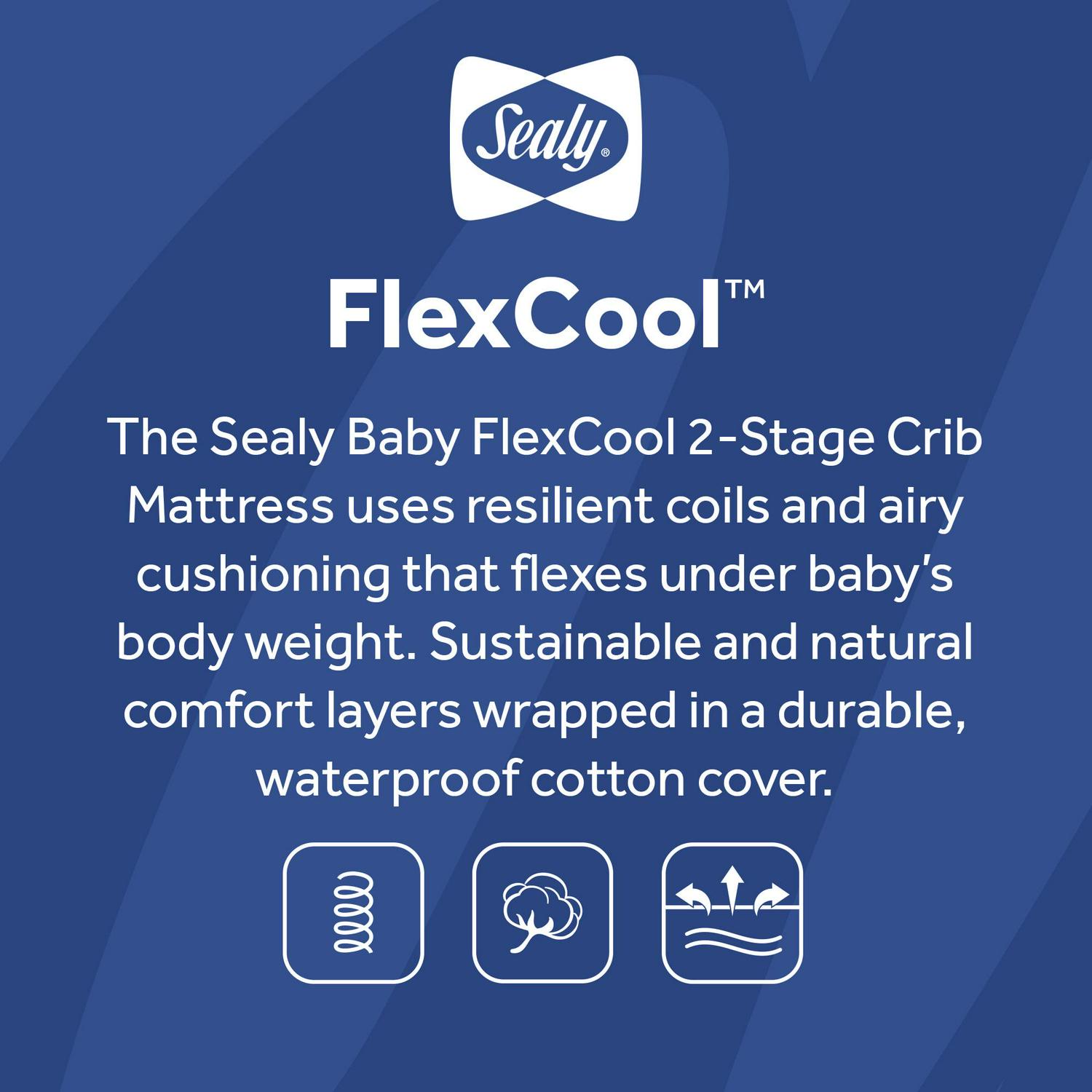The Sealy FlexCool 2-Stage Crib and Toddler Mattress offers a firmer infant side with durable steel coils to create a firm sleeping foundation, while the softer toddler side offers a lightweight, airy cushioning that contours to baby s body for added support and comfort.