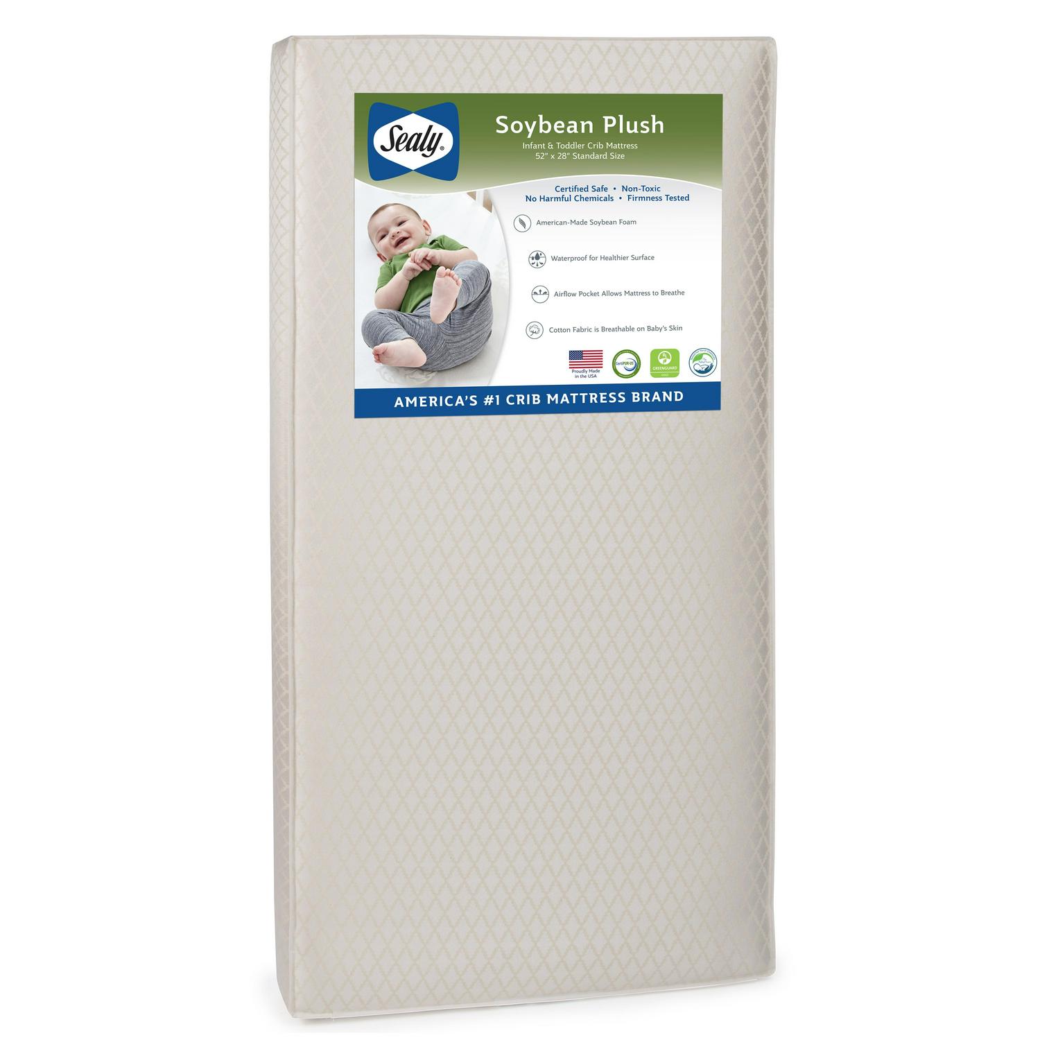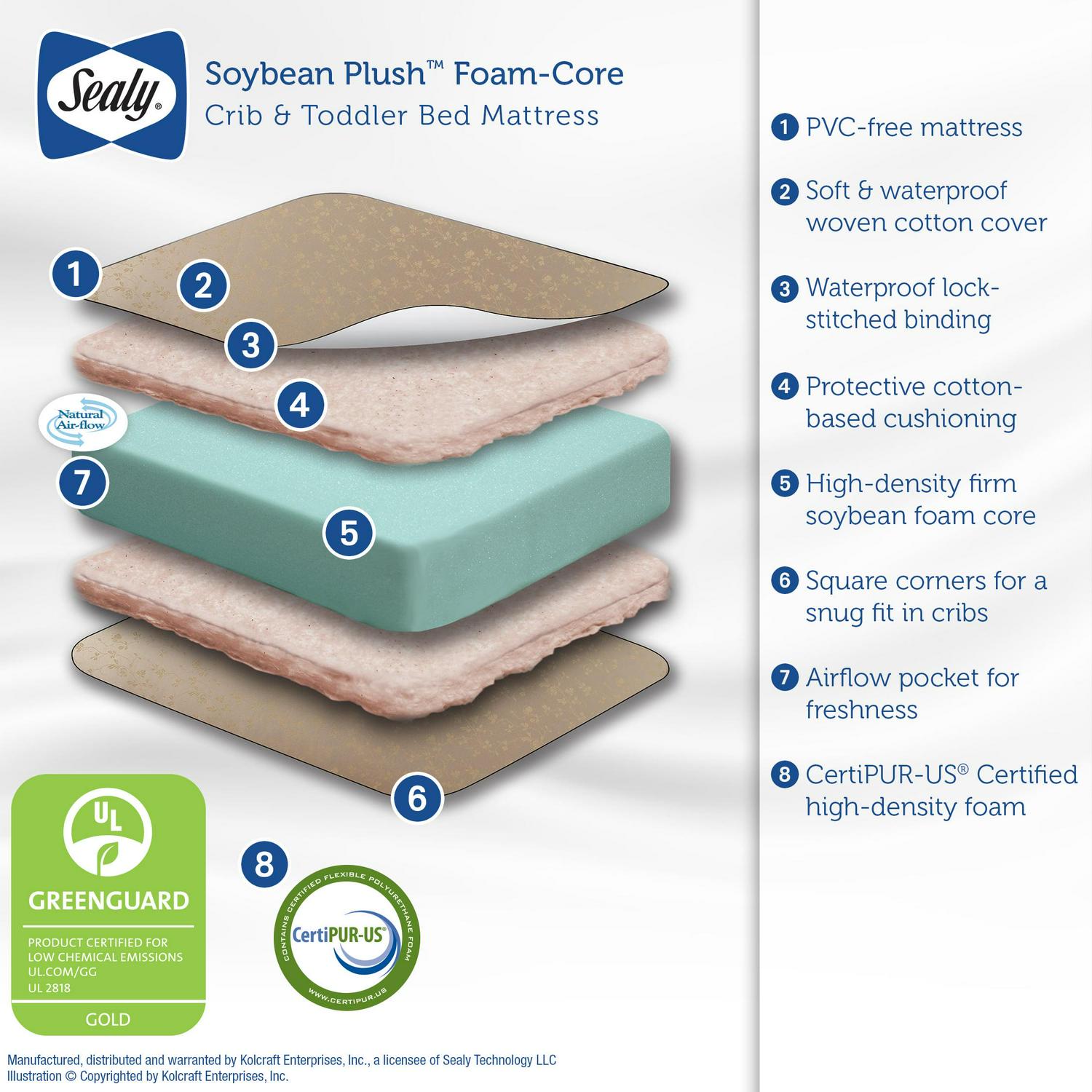 The Sealy Soybean Plush Foam-Core Crib and Toddler Mattress is simplicity at its best: a lightweight, highly-durable soy memory foam crib mattress with a luxurious cotton fabric cover that is breathable on baby s skin. GREENGUARD GOLD Certified for a healthier indoor environment and passes the latest state, federal and ASTM crib mattress standards for added quality and protection.