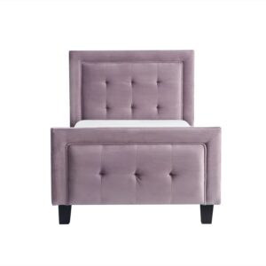 Solid and engineered wood frame; Soft-touch polyester velvet in a variety of colors; Solid bottom panel for a stable sleeping surface; Available in Earl Grey, Blue, Lavender Mist