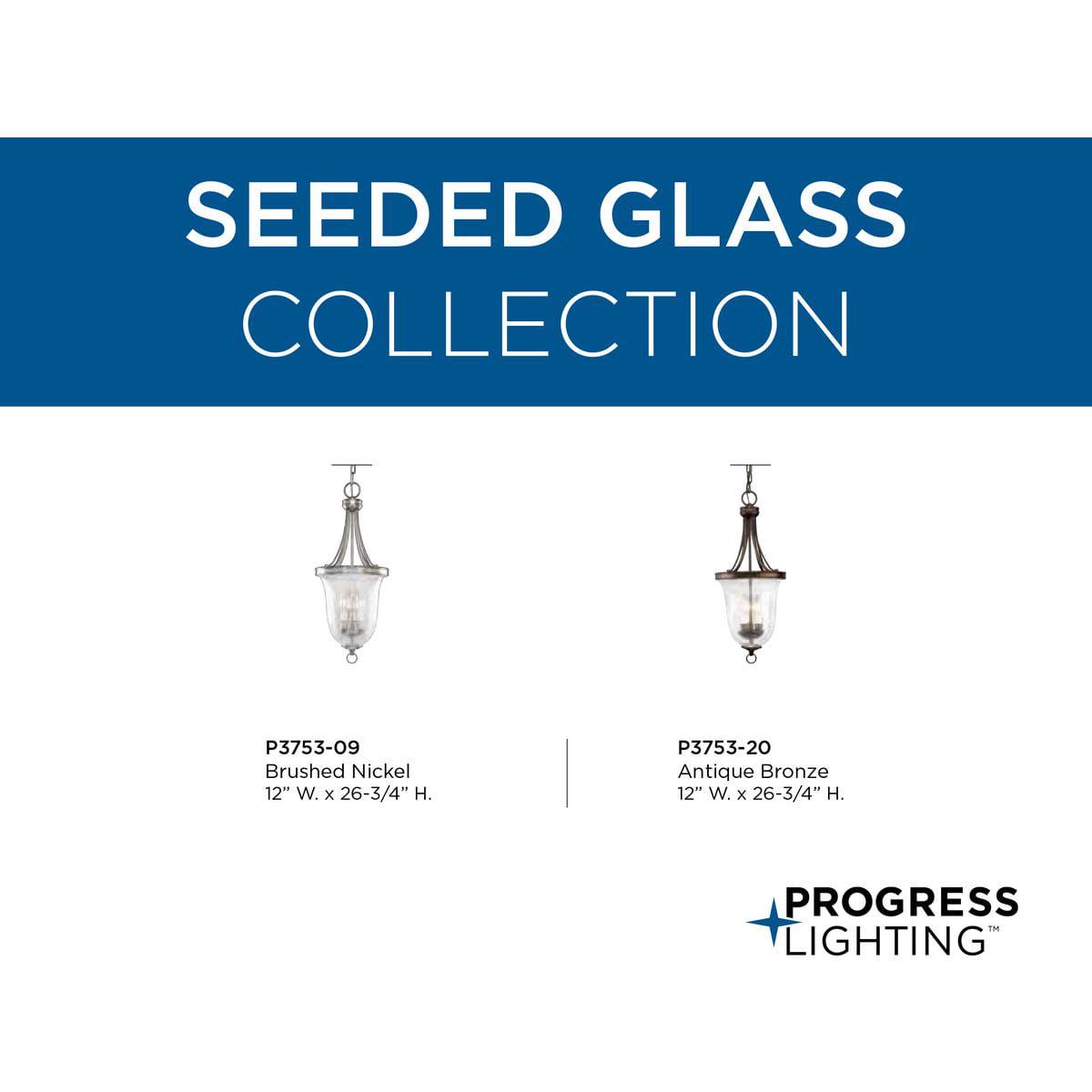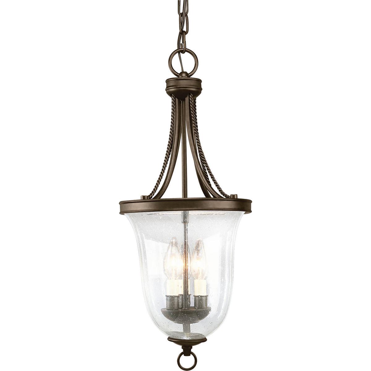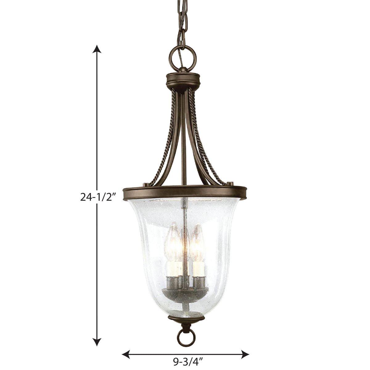 Three-light foyer pendant with clear seeded glass, delicate rope detailing and candle cluster in bowl. Great for entry ways or kitchens. Antique Bronze finish.