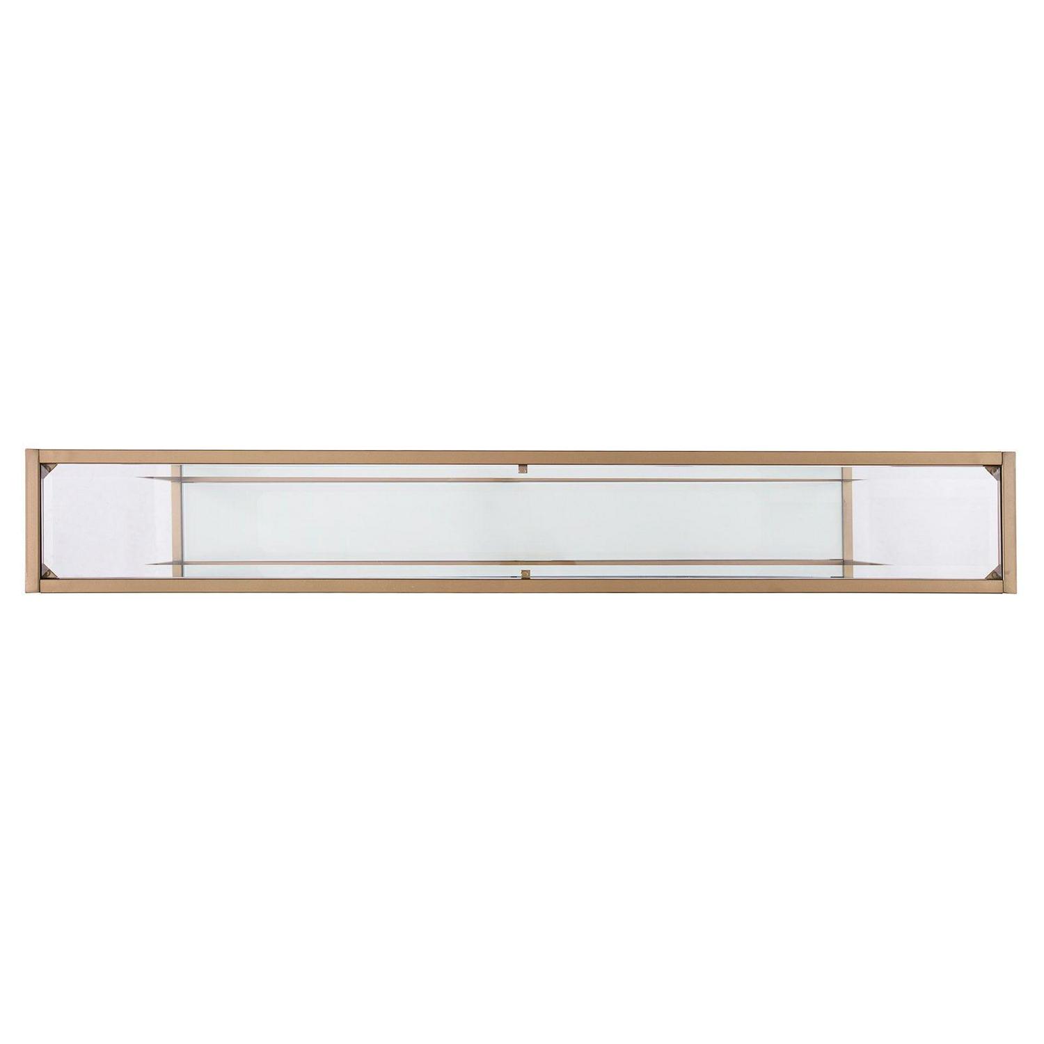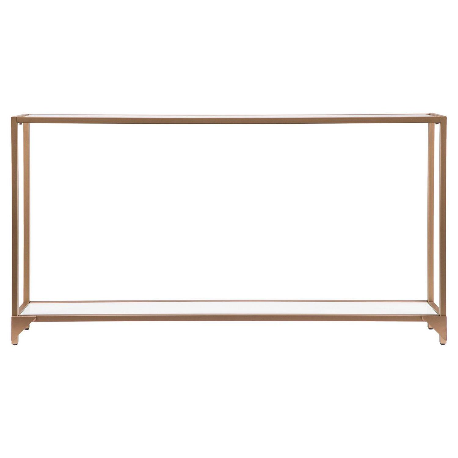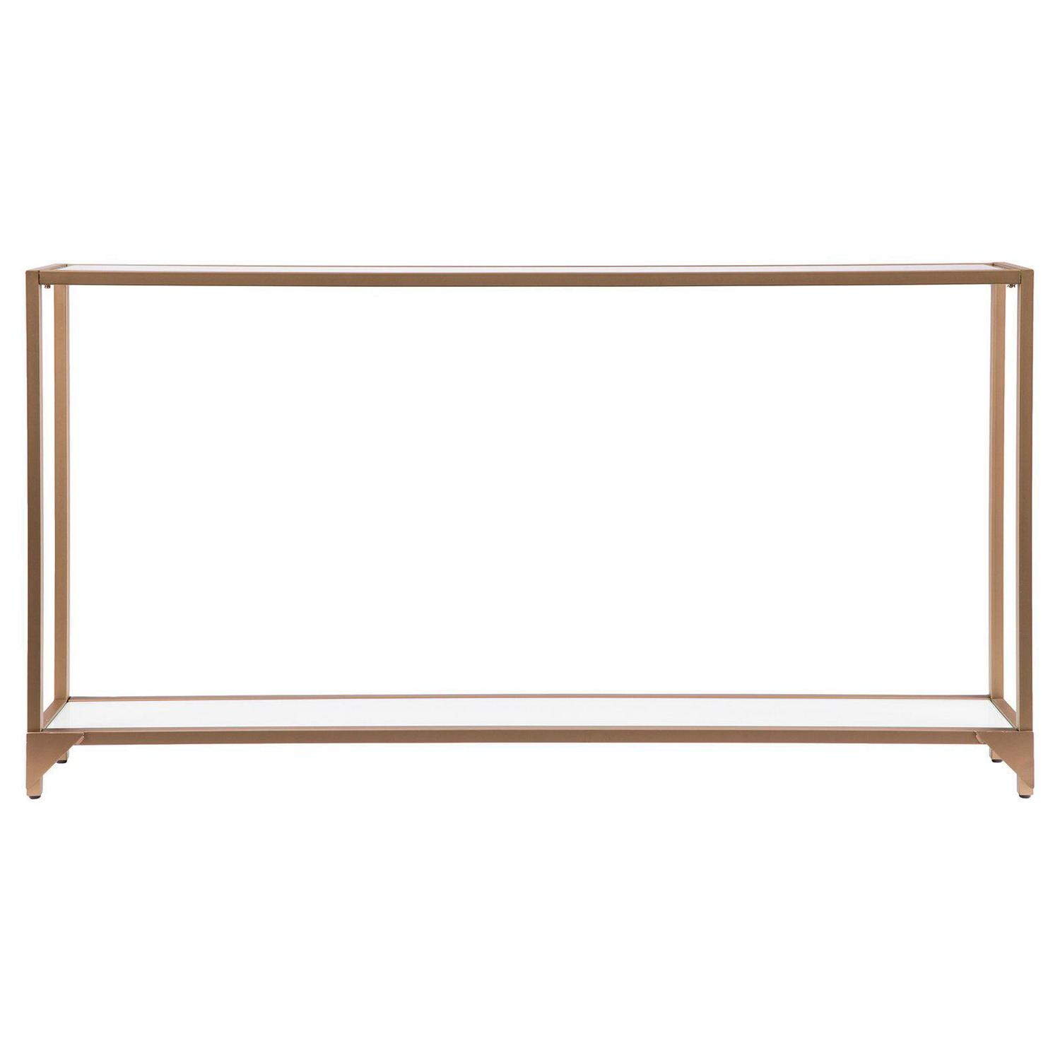 Add a touch of glam to any space with the shimmer of gold and glass in this anywhere console. Simple, sleek silhouette with clear glass top shelf and white glass bottom shelf creates two tiers of storage, enhancing formal and casual spaces. Narrow metal and glass media console adds drama under your wall mounted TV. Create a memory vignette with photos and mementos on your sofa table, or shine a spotlight to a focal wall. This slim anywhere console stops the show in your home.