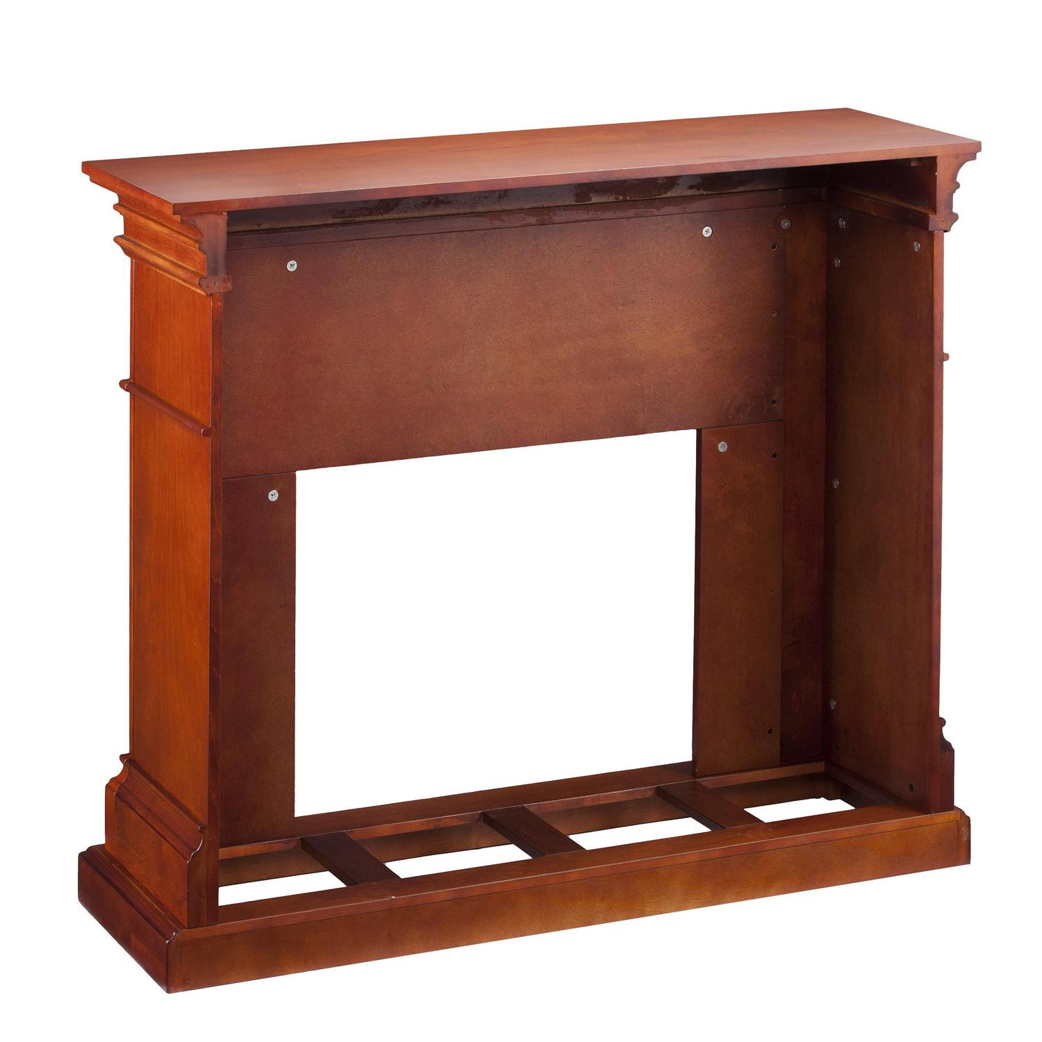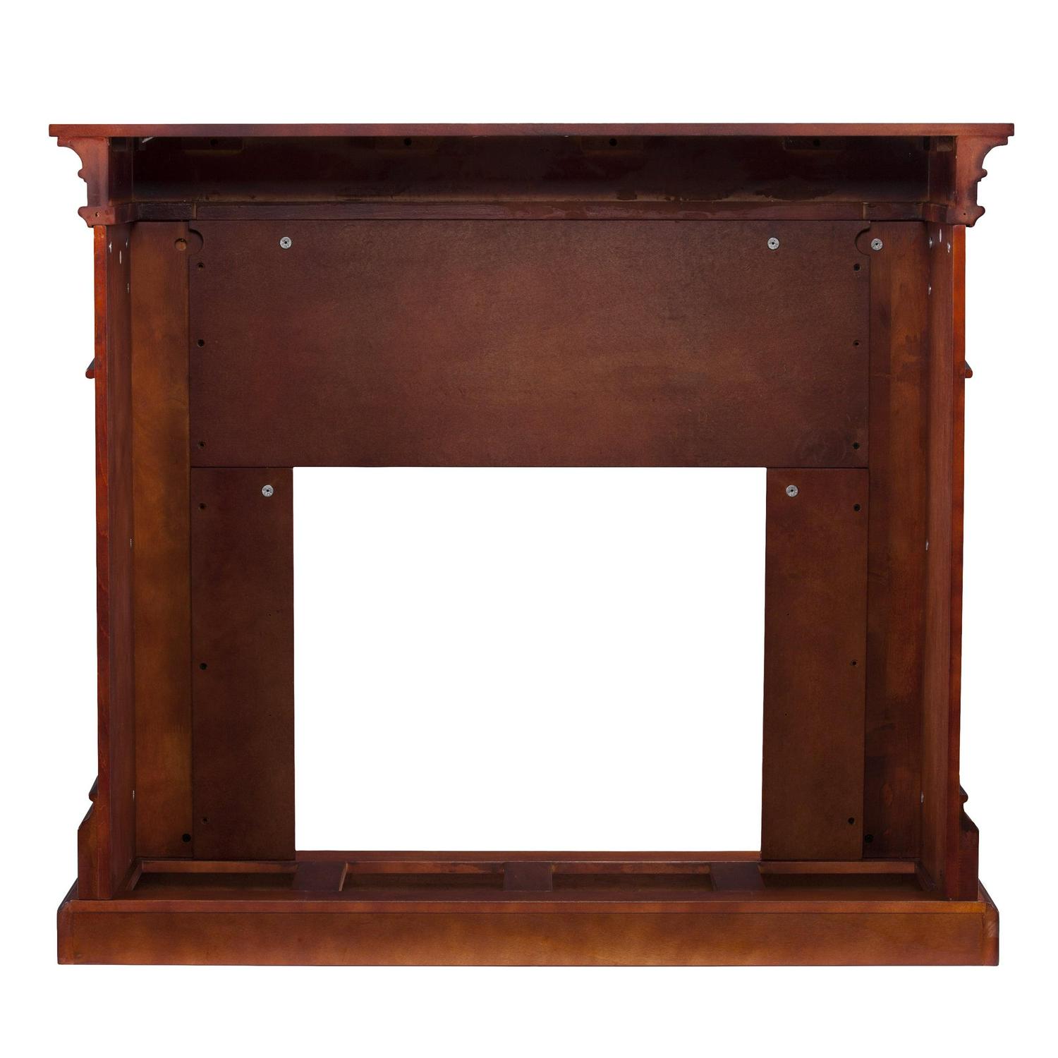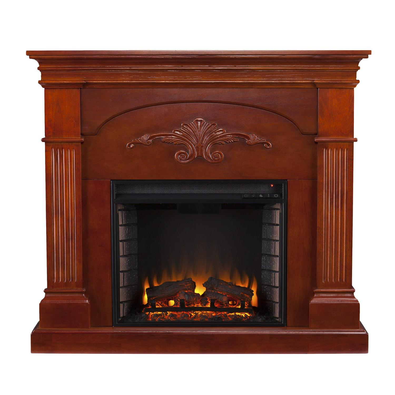 Finished with a warm mahogany stain, the elegance of this electric fireplace is ideal for enhancing your home’s cozy appeal. Fluted columns on each side and a decorative scroll appliqué create one beautiful home accent. All of your guests are sure to marvel at such a wonderful centerpiece. Portability and ease of assembly are just two of the reasons why our fireplace mantels are perfect for your home. The firebox has realistic, multicolor flickering flames and glowing embers with an interior brick design for a more lifelike look. This electric fireplace features energy efficient LED and requires no professional installation, making it a cost effective way to upgrade your living or media room. Easy to use remote control offers 4-way adjustability to warm the room conveniently. Safety features include automatic shutoff and glass that remains cool to the touch. Turn off the heat to enjoy the fireplace ambience year round!
