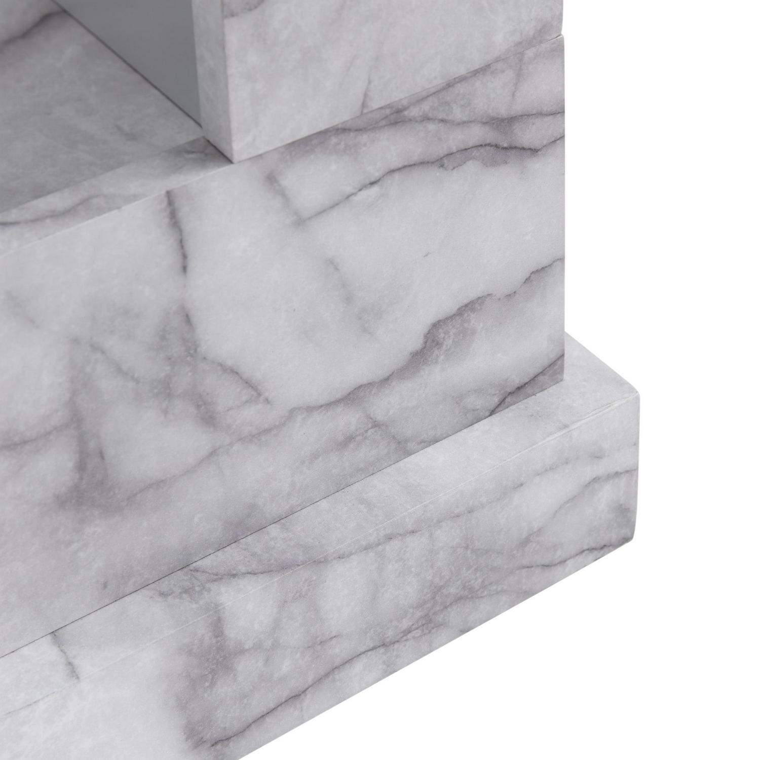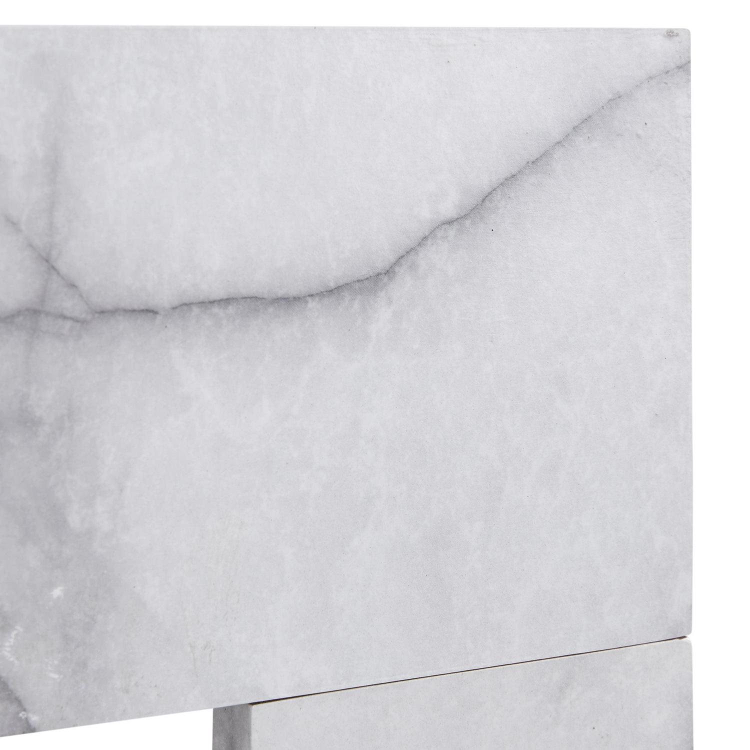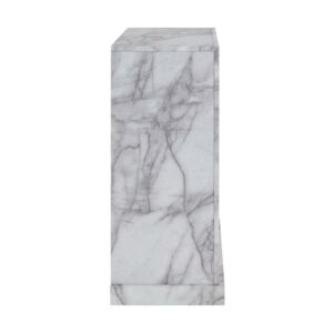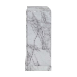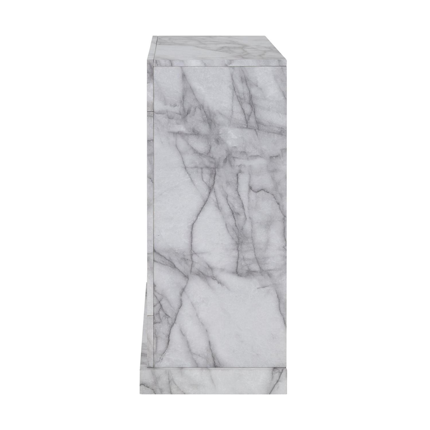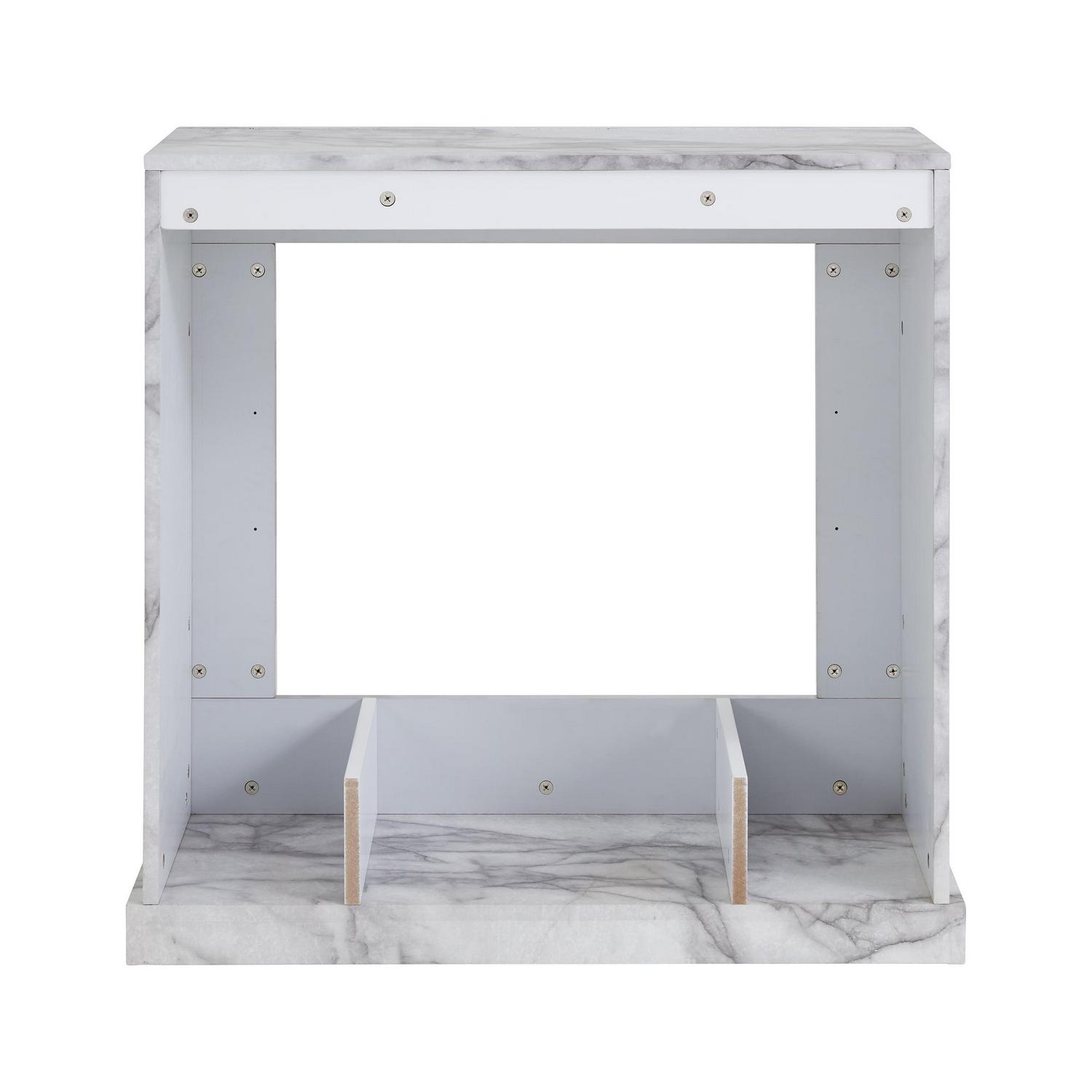 The contemporary class comes home with this faux marble fireplace. Clean lines and angles offer a no-frills approach to a minimalist lifestyle, while exquisite white faux marble canvases the surround, crafting a modern look. Glowing faux fire logs add ambiance with flickering LED flames and lifelike embers, with or without heat. Warm up so you can slow down with this faux stone electric fireplace in your living room or open concept living space.