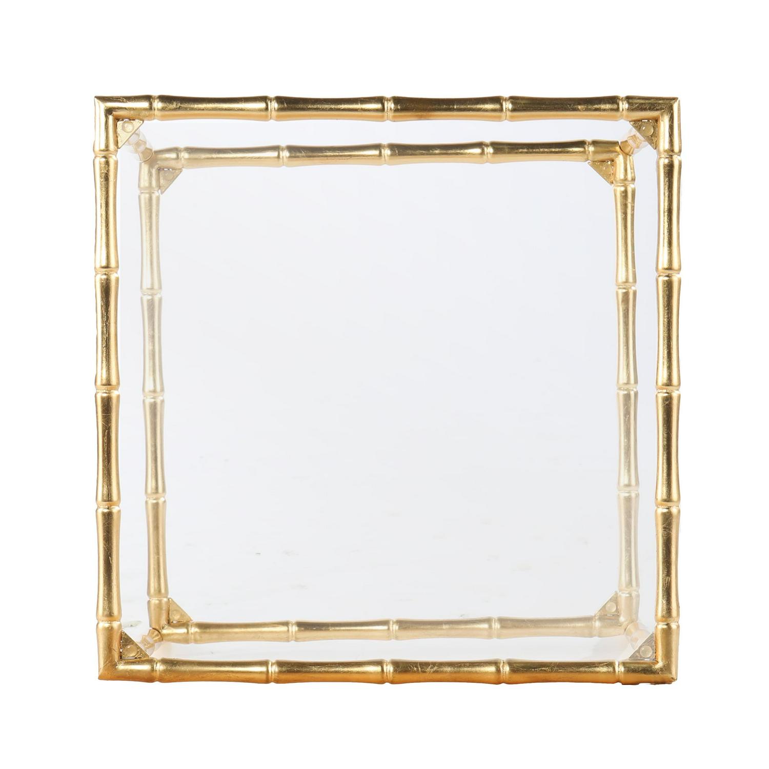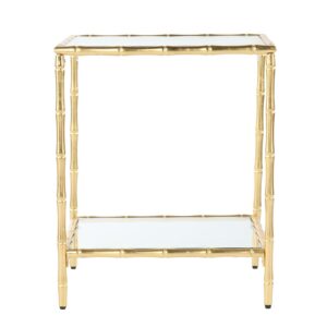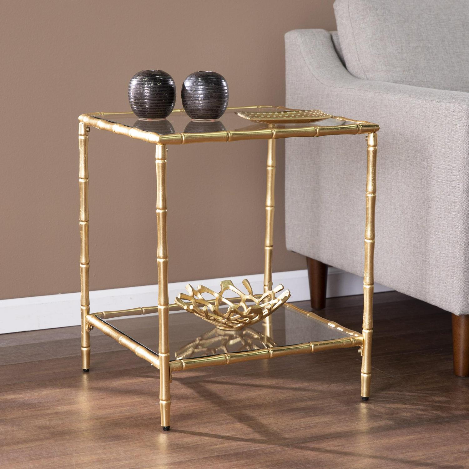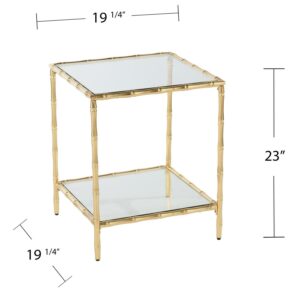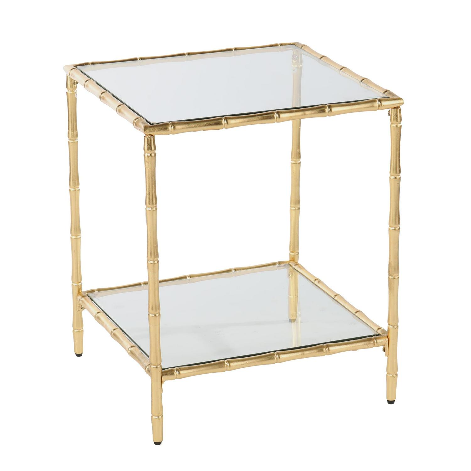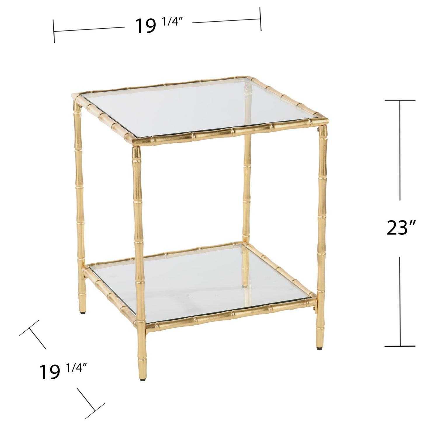 Square away extra storage with this two-tier end table. A spacious glass top holds a reading lamp and your cup of coffee, while the open shelf displays décor pieces or your reading collection. Bamboo-inspired frame details add texture and an organic feel, beautifully blending classic design and contemporary style. Slide this accent table alongside your living room sofa or into your small space floor plan for sleek style that never disappoints.