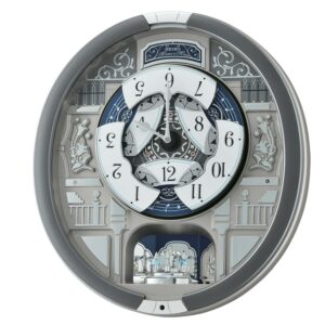 Seiko’s melodies in motion clocks are enchanting and magical. In this clock, musical motifs bring music to life. On the hour, the dial opens to reveal a turning decorative musical wheel and plays one of eighteen of the finest quality sound melodies plus an opening and ending melody. It has a grey case, a demonstration button, and volume control. This clock is enclosed in glass, the rotating pendulum features Swarovski crystals and an off/on switch. This clock will light up your house year-round.