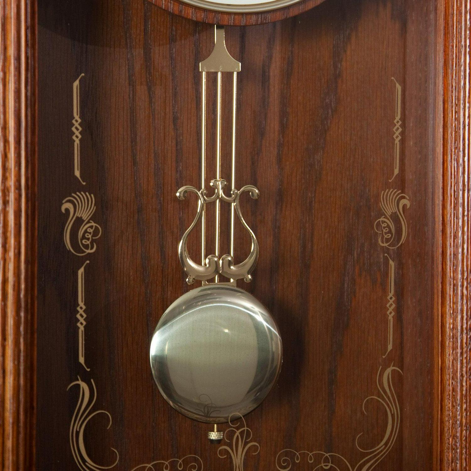 Seiko Regal Oak Wall Clock with Pendulum features intricate wooden carvings and gold details will upgrade your home. The wooden case features columns on each side with metal accents. Chiming every quarter-hour with hourly strikes it has adjustable volume that can be silenced during the night. Powered by 1 C battery (included). Overall dimensions: 28.25 X 11.75 X 3.75 inches. This analog clock holds a quartz crystal movement allows for the most accurate time keeping. Perfect accent to add to any home or office. Perfect for all ages from tween to adult.