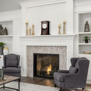 The suki mantle clock has an elegant dark brown solid wood alder case with a glass cover and a white dial with roman numerals. The contemporary dial features roman numerals at the quarter-hour positions with hour markers and a minute track surrounding the metal dial. The bezel around the dial is a bright chrome with a polished cylindrical pendulum that silently swings back and forth. Westminster or Whittington quarter-hour chime and hourly strikes with volume control and an automatic night-time chime silence switch. The chime may be turned completely off with the volume control.