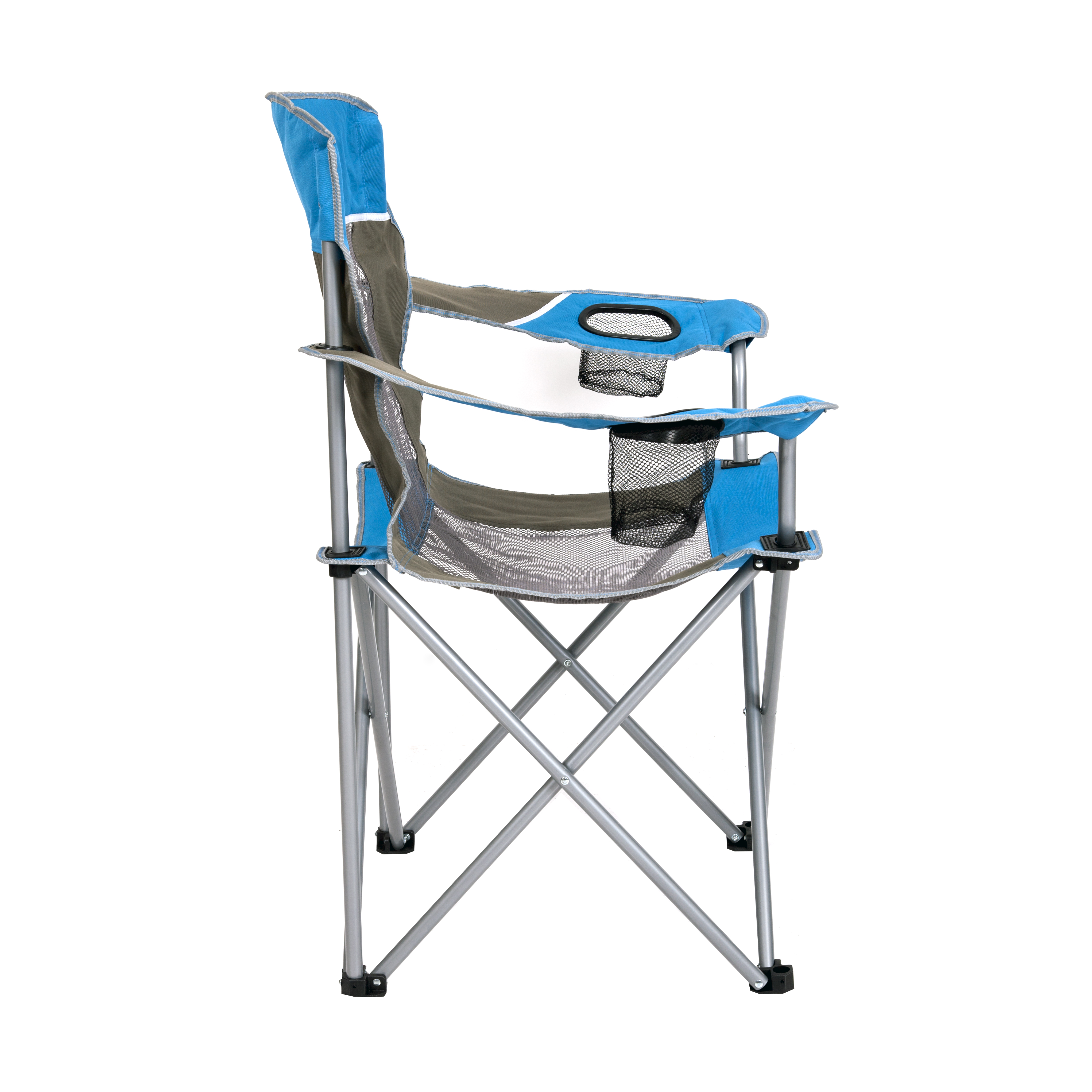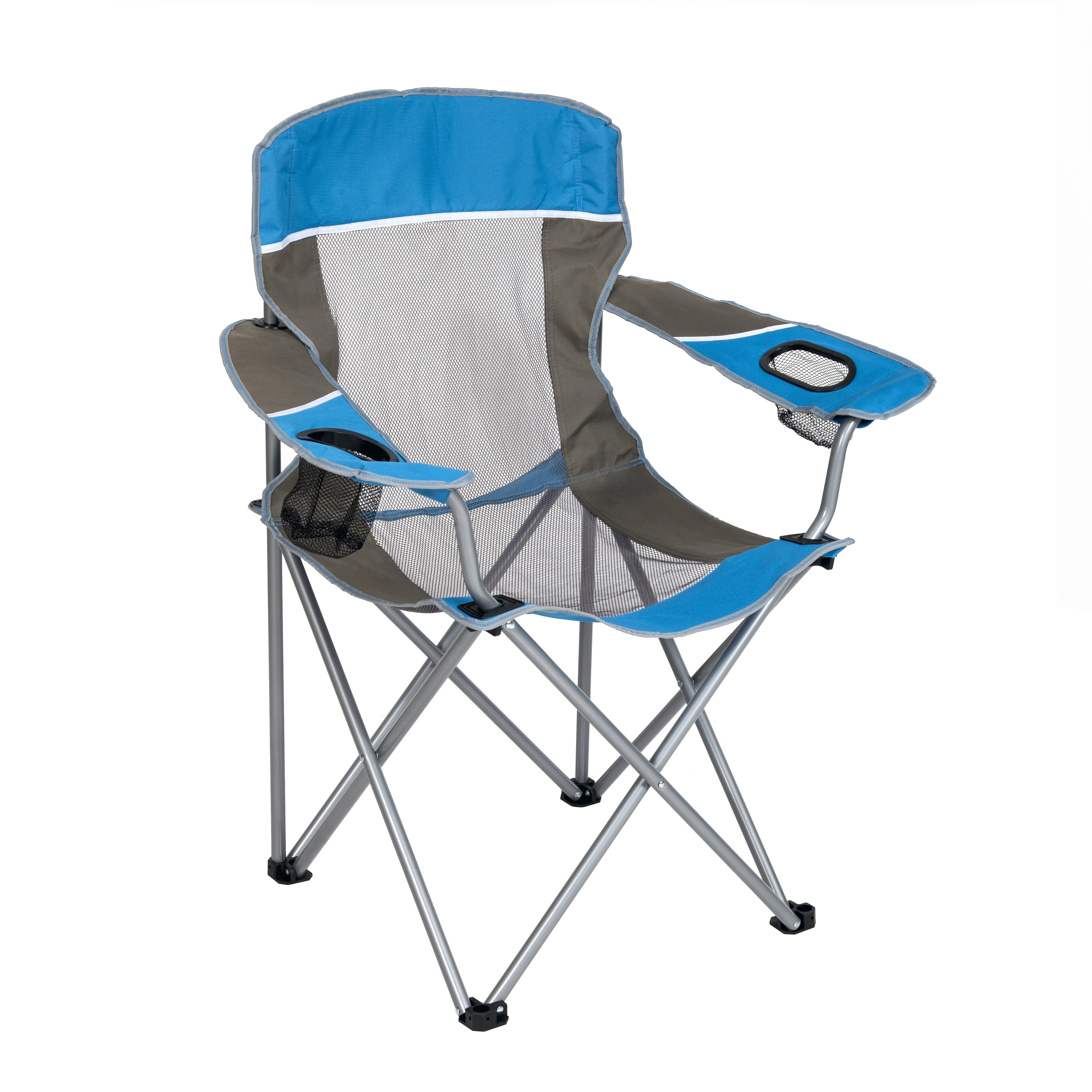 SEINA Blue/Grey Oversized Folding Mesh Camping Chair with 2 Cup Holders The SEINA Oversized Mesh Quad Chair is offered in blue and gray. It’s mesh body allows for a cool and enjoyable experience while air can flow through easily. The user can enjoy pure comfort with the oversized design to fit most body types. The chair comes ready to use and requires no assembly whatsoever. Collapsible Light weight Heavy-duty Breathable fabric Comfortable Large frame