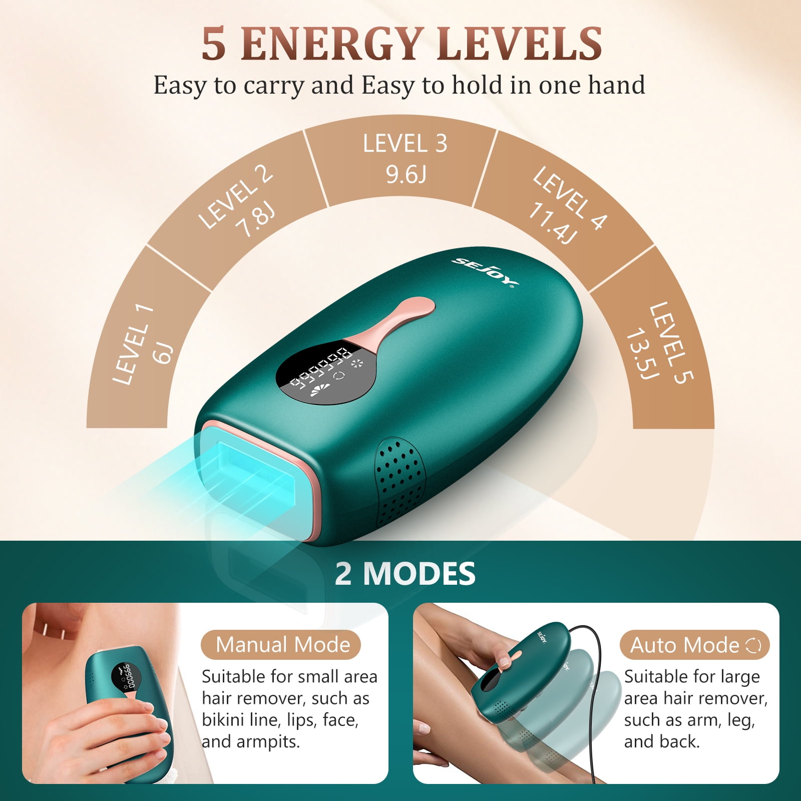 Life-Long Use The epilator hair removal upgrade to 999,999 Flashes, enough for lifelong. Please keep it plugged in an outlet when in use, non-battery operated, you will never need to buy a replacement cartridge for your hair removal device which is an economical at-home solution. Get Salon Results in Just Four Weeks Enjoy smooth skin and get a noticeable reduction in hair. After the first four weeks of treatment continue with biweekly touch-ups to look your best year-round. Sejoy?s flat light window design targets hair at the root while ensuring each flash is painless and efficient. Industry-leading Ice-Cooling Technology Get silky-smooth results without the pain. Sejoy adopts ice-touch technology to lower the temperature from 158? to 50? at the point of contact with your skin. Suitable for Full-body Use Get to work on pesky hairs with Sejoy. Simply select the intensity level suitable for you and treat hair on your arms, legs, underarms, bikini line, and more. What?s in the Box Get fantastic results right from your sofa. Sejoy IPL Hair Removal Package includes the Device, Razor, and Sunglasses. It?s all you?ll need to look and feel your best throughout the seasons. Adjustable Energy Levels The hair removal device has 5 different energy levels to adapt to different skin sensitivities, please gradually increase the level from the first gear. Auto & Manual Mode According to the areas where you want to choose the correct flashing mode: Auto Continuous Mode- For large areas ( Armpits, Legs, Arms, Chest ). Manual Single Mode- Suitable for small areas. (Fingers, Underlip, Bikini Line) Life-Long Use Get Salon Results in Just Four Weeks Industry-leading Ice-Cooling Technology Suitable for Full-body Use What?s in the Box Adjustable Energy Levels Auto & Manual Mode How often to use the hair removal? 1-4 weeks: 3 Times a week. Over 75% hair starts to fall off naturally. 5-6 weeks: Twice a week. New hair falls off and is inhibits growth. 7-8 weeks: Once a week. Hair becomes thinner and less. Q&A Q: Does IPL work on all skin types and hair colors? A: Unfortunately, not all hair and skin types are suitable for IPL treatment. Generally speaking, IPL and laser hair removal do not work on blonde and red hair or very dark skin. Q: Which areas of my body can I use my handset on? A: The Sejoy handset is effective to use everywhere that hair grows, including your legs, underarms, arms, chin, hands, neck, back, and bikini line. It is not recommended to use around your eyes without protective eyewear.
