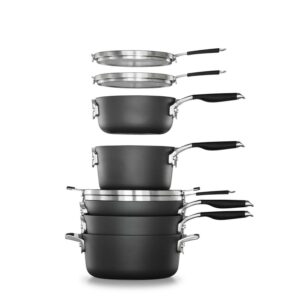 An essential addition to any kitchen, Select by Calphalon Space-Saving AquaShield Nonstick 14-Piece Cookware Set helps you cook more smoothly thanks to its improved* easy-release surface. Featuring AquaShield nonstick technology, this cookware line performs like new 40% longer* for remarkable food release over and over again. This space-saving line also securely stacks to save 30% more space than its non-stacking counterparts. Thanks to their unique design and flat glass covers, the pots and pans stack and nest in any order when stored on other items of the same diameter. Made with water-based nonstick and a hard-anodized exterior, it’s dishwasher-safe for quick cleanup. Silicone comfort-grip handles make lifting and moving easy and stay cool on the stovetop. This nonstick pots and pans set is oven-safe up to 400 degrees F, so it can go from the stovetop into the oven for heating and cooking versatility. Elevate your cooking experience with Select by Calphalon, and enjoy exceptional performance with endless possibilities. ( vs. previous generation of Select by Calphalon).