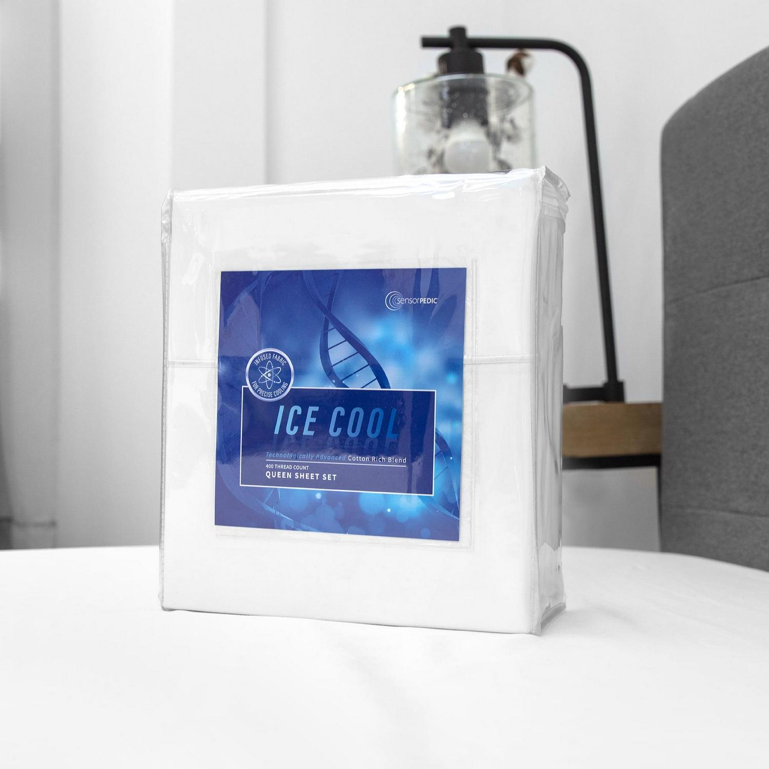 Add a layer of cool comfort to your bed with the SensorPEDIC Ice Cool Sheet Set, featuring a luxurious 400 thread-count, cotton-rich fabric blend that offers strength and softness while being technologically advanced to help you sleep cooler. These sheet sets include 1 flat sheet, 1 fitted sheet, and either 1 or 2 pillowcases depending on bed size and are available in a variety of color options including White, Cream, Dark Blue, Grey, and Surf Spray Blue.