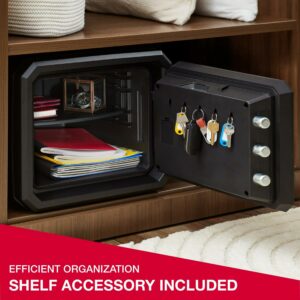 This home safe, fire-resistant and water-resistant, protects what matters even while critical time passes, the temperature climbs and emergency crews make their way to the scene. It doesn t take much time learn the value of rigorous fire testing; a house fire can reach more than 1,100 °F in just 3.5 minutes. This fire box is UL Classified to protect valuables for 1 hour at 1700° and ETL verified to protect digital media for 1 hour. Additional water protection (ETL verified for 5 inches for 24 hours) means safe box can withstand not only flames and extreme heat, but also the water or fire retardant that will extinguish it. It also means the fire-resistant safe box can be bolted down in the basement, limiting any water risks. Basement placement is popular because it means the fire-resistant safe won t fall from higher levels in the event of structural collapse, and the bolt down kit makes it possible to store safe almost anywhere. The newly designed bolt down kit maintains the integrity of the safe s water protection. The metal handles are easy to operate, and the safe door audibly confirms when it s closed. The adjustable shelf, key hooks and door pocket make it easy to find belongings in an emergency.
