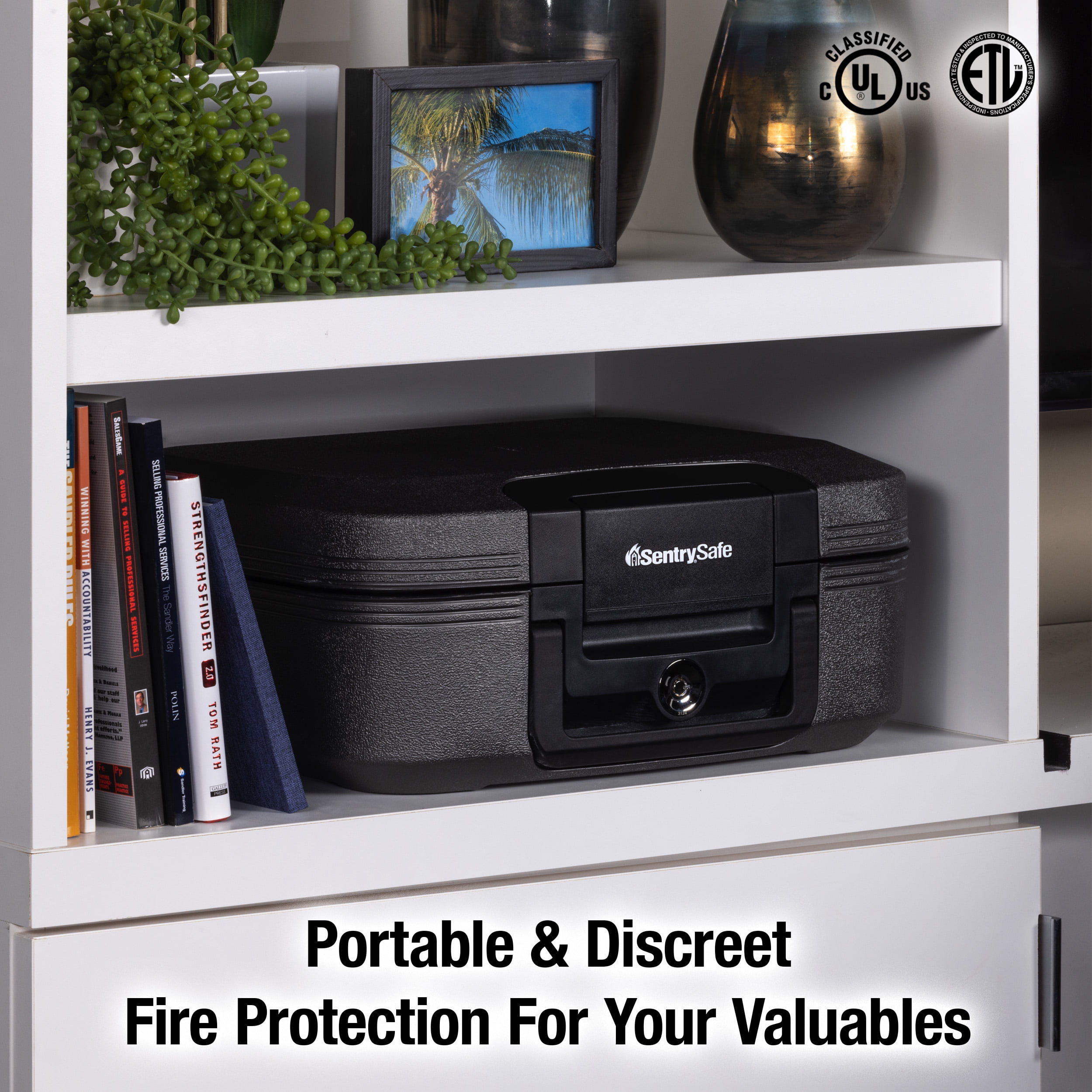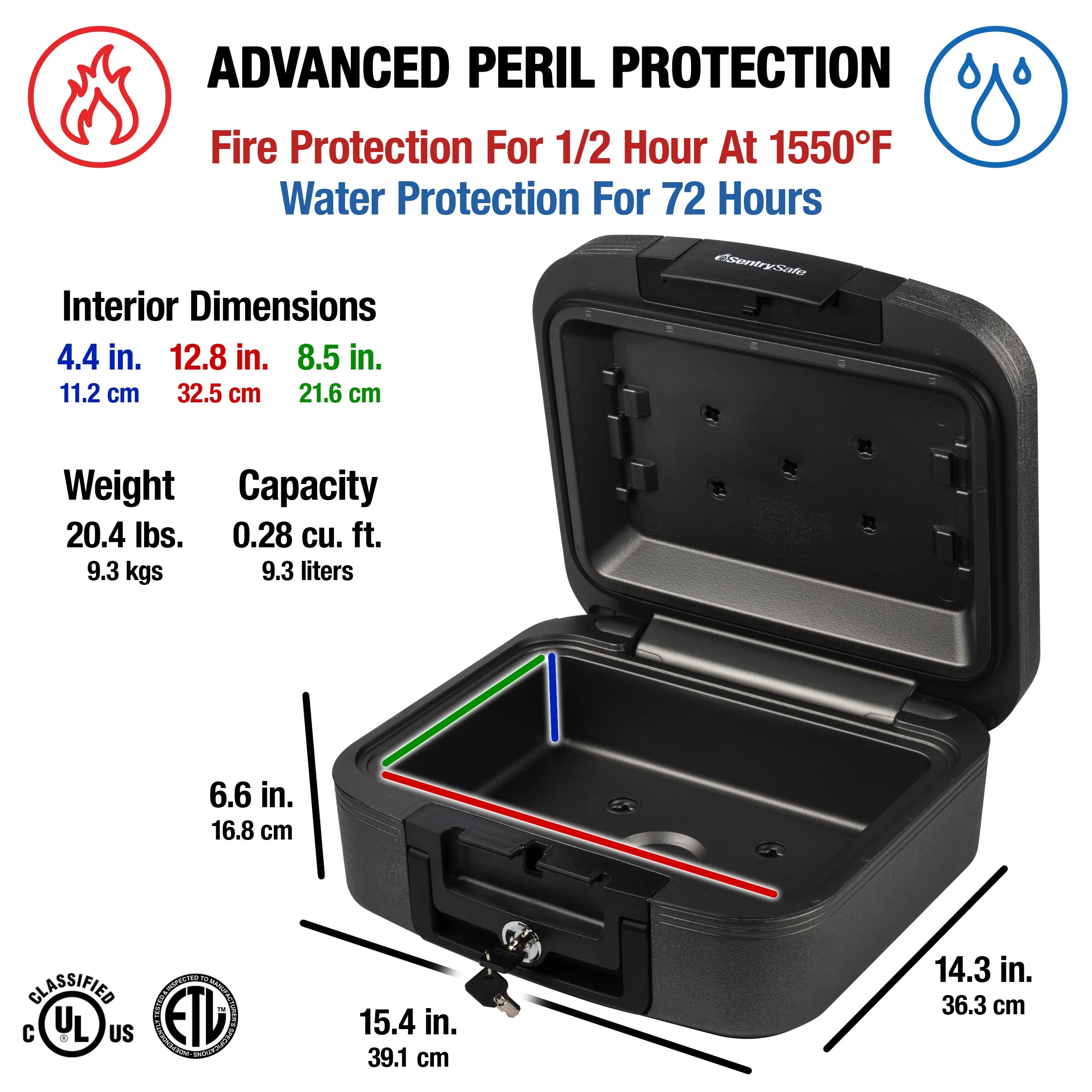 SentrySafe CHW20201 Fire-Resistant and Water-Resistant Chest Safe with Key Lock 0.28 cu. ft.: This rugged chest provides quality protection for small valuables, digital media and important documents. It’s fire- and water-resistant and includes a carrying handle for easy grip and transportation. Privacy key lock keeps unwanted viewers or children away from the contents of the safe. Fire-resistant safe is UL Classified to protect your valuables in a fire for a 1/2 hour up to 1550°F (843°C). Water-resistant safe is ETL Verified to protect your valuable items from flood damage up to 72 hours. Exterior size: 6.6 in. H x 15.4 in. W x 14.3 in. D; Interior size: 4.4 in. H x 12.8 in. W x 8.5 in. D; Capacity: 0.28 cubic feet; Weight: 20.400 lbs.