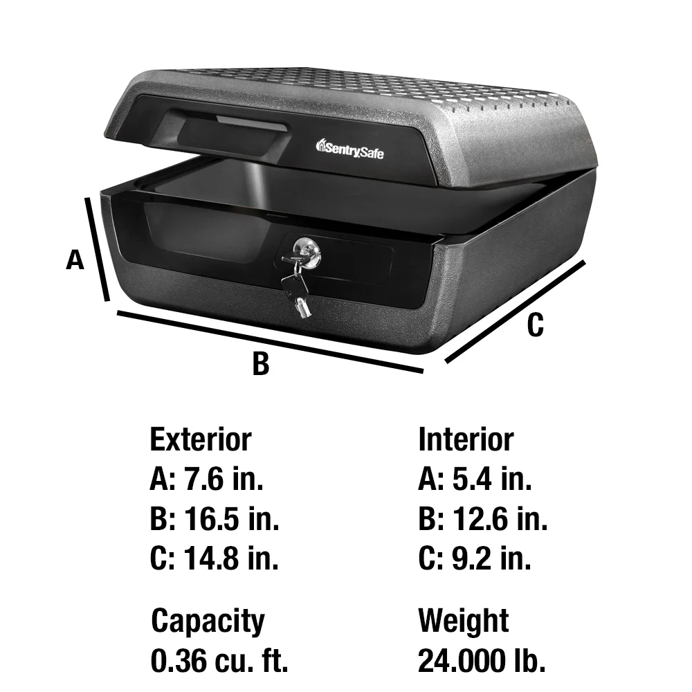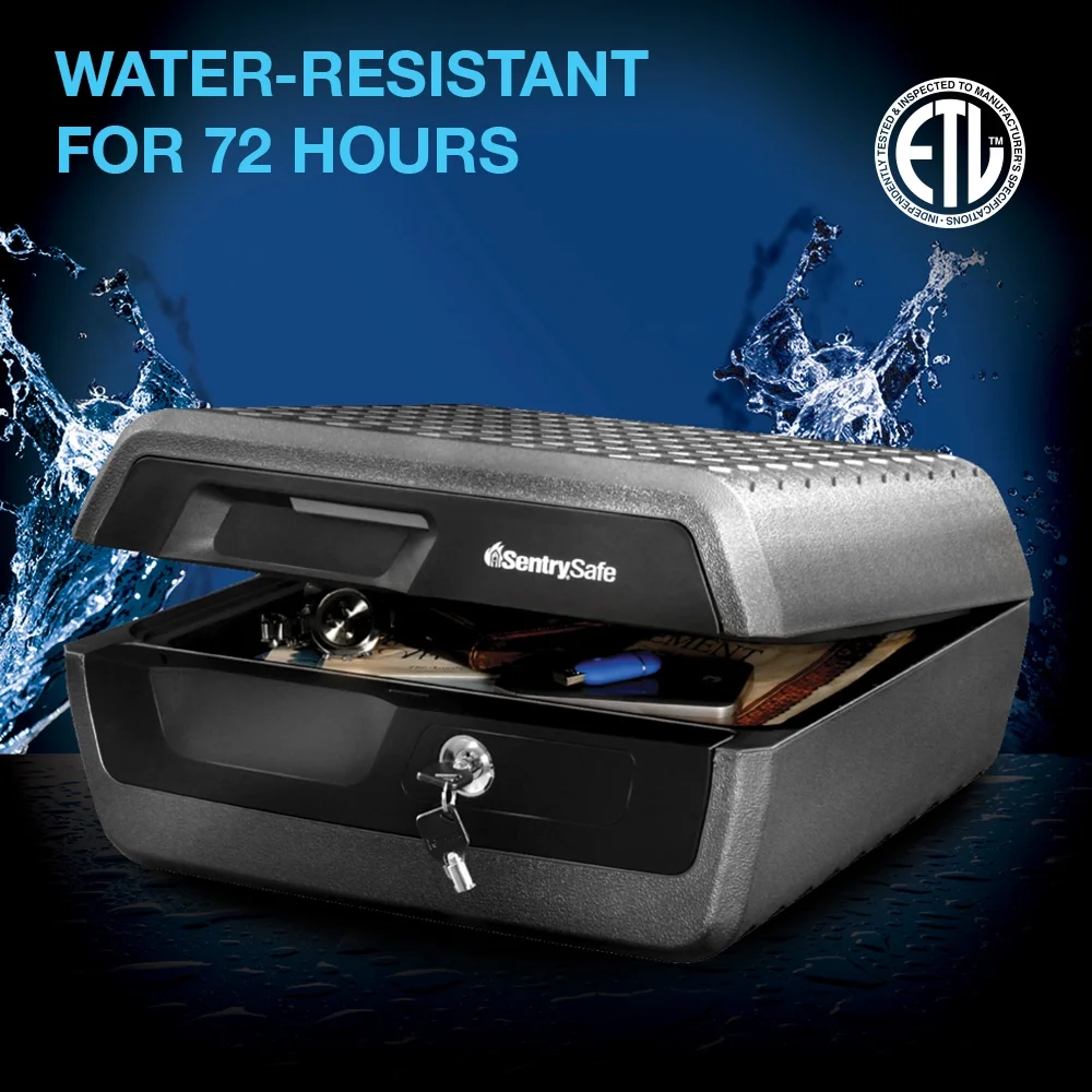 SentrySafe CHW30200 Fire Resistant Box Safe and Waterproof with Tubular Key Lock 0.36 cu. ft.: Fireproof Box Safe is UL Classified to protect your valuables in a fire for a 1/2 hour up to 1550°F (843°C) Waterproof Box is ETL Verified to protect your valuable items from flood damage up to 72 hours Chest features a tubular key to help prevent unauthorized access in case of theft SentrySafe digital media protection is ETL Verified to protect tablets, phones, external hard drives, memory cards, USB drivers, CDs, DVDs and other electronic storage devices Exterior: 7.6 in H x 16.5 in W x 14.8 in D; Interior: 5.4 in H x 12.6 in W x 9.2 in D; Capacity 0.36 cubic feet; weighs 24 pounds