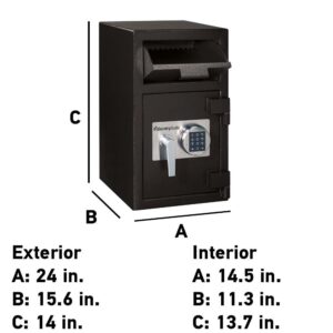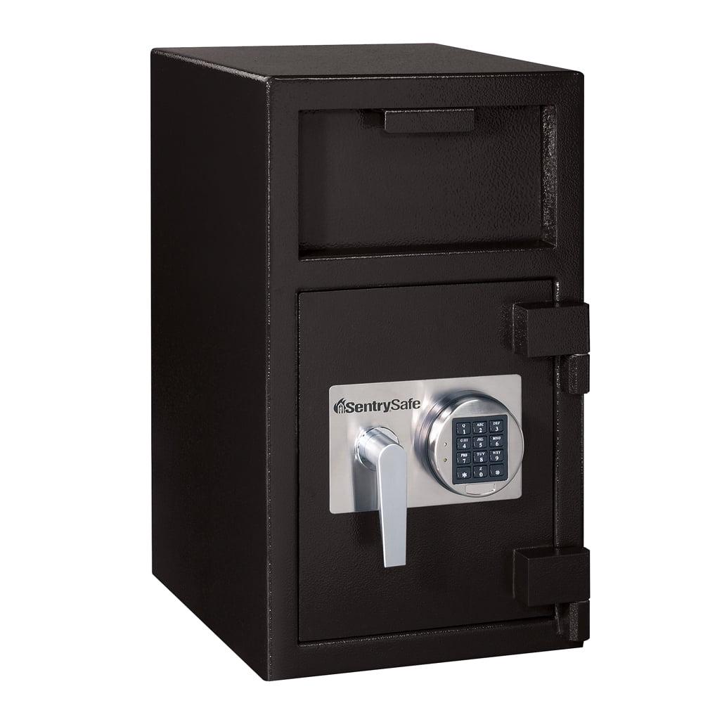 The SentrySafe Depository Safe DH-109E is built to provide secure storage for your business assets. The DH-109E is ideal for safeguarding cash receipts, deposit slips, credit cards and other valuables from theft and burglaries with a relocking device to defend against drill attacks and a time delay to prevent unauthorized after-hours access. Digital locking safe uses a programmable 1-8 digit code. Anti-Drill door features a re-locking device that helps protect against drill attacks. Anti-fish hopper helps prevent cash and deposits from being stolen with extendable tools or hooked wires. Solid steel construction ensures durable and reliable protection. 3 Live-locking bolts provide advanced protection against theft and unauthorized users. Exterior size: 24.0 in. H, 14.0 in. W, 15.6 in. D; Interior size: 14.5 in. H, 13.7 in. W, 11.3 in. D. Capacity: 1.3 cu. ft.; Weight: 108.000 lbs.