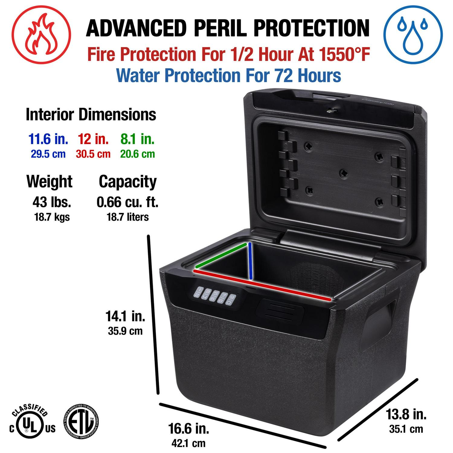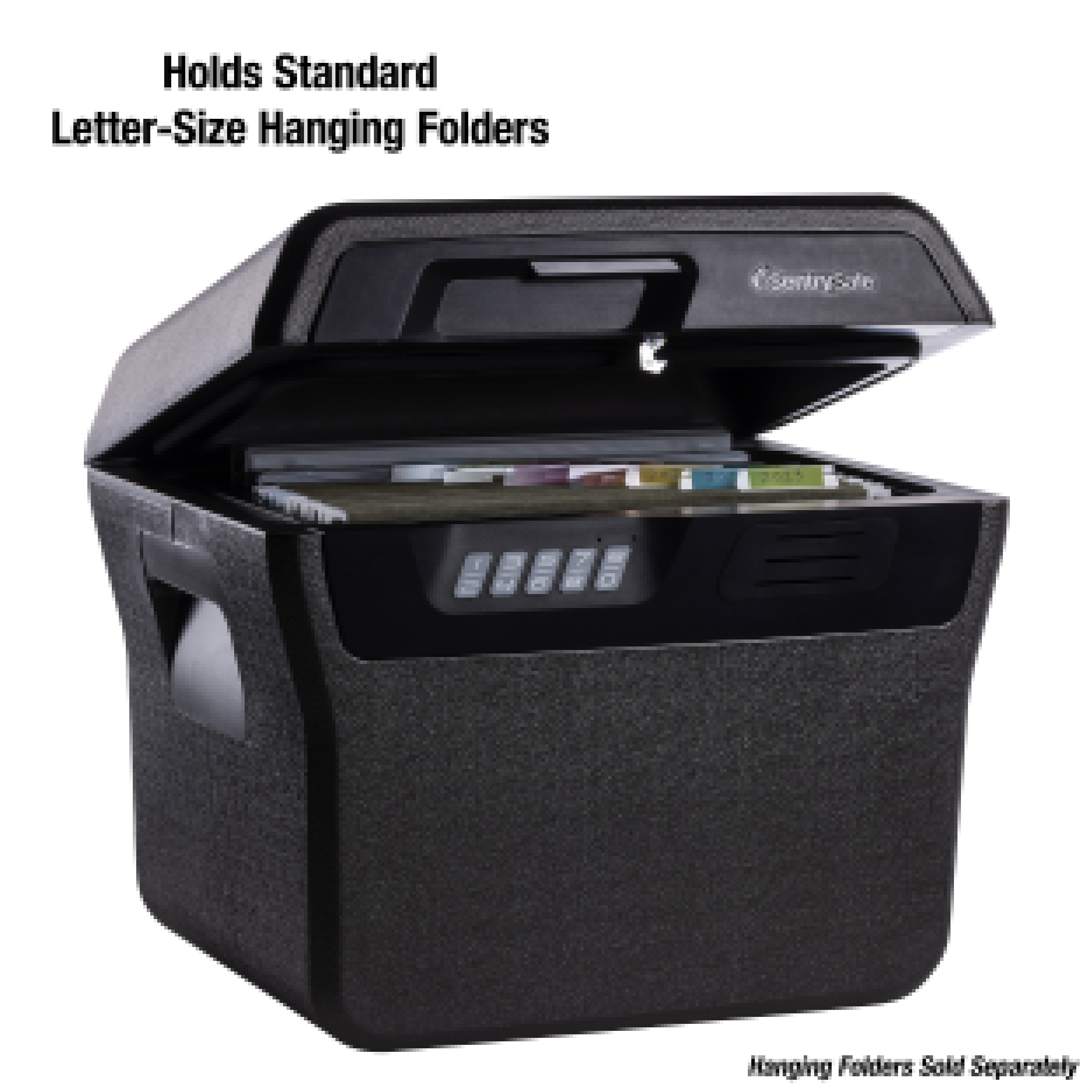 The SentrySafe FHW40300 Fire and Water-Resistant File Safe with Digital Lock includes a programmable, digital lock that allows consumers to choose their own combination for additional security and personalization. The FHW40300 accommodates hanging files and offers digital media protection. Fire-resistant file safe is UL Classified to protect your valuables in a fire for 1/2 hour up to 1550°F (843°C). Water-resistant file safe is ETL Verified to protect your valuable items from flood damage up to 72 hours. File safe accommodates hanging files (sold separately) and includes a carrying handle to make moving your file safe easy. Exterior dimensions: 14.1 in. H x 16.6 in. W x 13.8 in. D; Interior dimensions: 11.6 in. H x 12.0 in. W x 8.1 in. D; Capacity: 0.66 Cu. ft.; Weight: 43.000 Lbs.