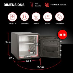 – Preset dial combination fire safe with secondary locking key for strong security; combination safe features four live-locking bolts, steel construction, pry-resistant hinge bar, shelf, and bolt down hardware