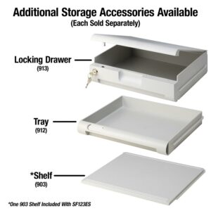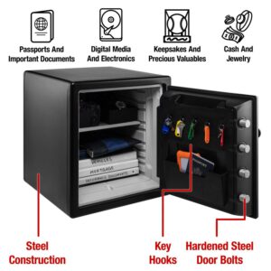 The SentrySafe SFW123ES Water and Fire-Reistant Safe with Digital Keypad offers reliable security for your valuables with solid steel construction, a pry-resistant hinge bar, and four large, one inch bolts. Safe is UL Classified to protect your valuables in a fire for 1 hour in up to 1700°F (927°C), and ETL Verified water resistance to protect your valuables in up to 8 inches of water for up to 24 hours. Fall protection means that even in the case of structural collapse, your safe has a strong likelihood of surviving the event without opening. In the case of emergency, you ll have enough to worry about without ordering new documents or mourning the loss of something that can t be replaced. The fire box is designed with an interior key rack, door tray and door pocket to keep your items organized, this safe is ideal for your home and office security needs. Exterior dimensions: 17.8 in. H x 16.3 in. W x 19.3 in. D; Interior dimensions: 13.8 in. H x 12.6 in. W x 11.9 in. D; Capacity: 1.23 Cu. ft.; Weight: 85.250 Lbs. SentrySafe P008E Portable Small Safe, 0.08 cu. ft., Black: