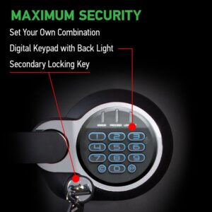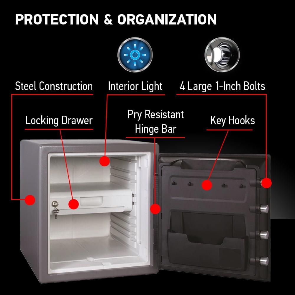 – Set your own digital combination fire safe with secondary locking key for strong security; digital combination safe features four live-locking bolts, steel construction, pry-resistant hinge bar, locking drawer, interior light, and bolt down hardware