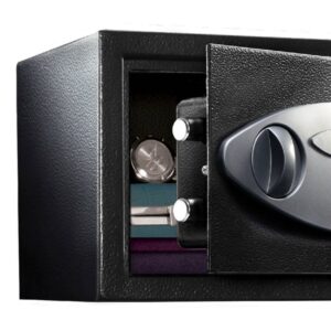 – Basic security safe for home as a theft deterrent; digital combination safe features two live-locking bolts, steel construction, concealed hinges, carpeted floor, and bolt down hardware