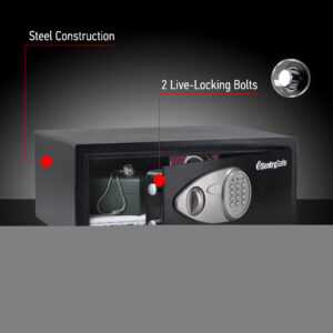 – Basic security safe for home as a theft deterrent; digital combination safe features two live-locking bolts, steel construction, concealed hinges, carpeted floor, and bolt down hardware