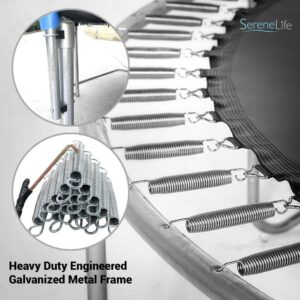 SereneLife Outdoor Jumping Trampoline – Backyard Home Sports Trampoline Style – Large Wide-Diameter Jumping Surface – Perfect for Kids, Children, Teens & Young Adults – Tall Protective Safety Net Cage Enclosure System – Waterproof Rated & Weather-Resistant Design – Reinforced Bouncy Jumping Mat Surface – Rugged & Durable Leg Base Frame Construction – Stable Platform Base for Driveway and Grass Placement – Family Fun, Recommended for Ages 6+ and Up – Lab Tested and Safety Certified.