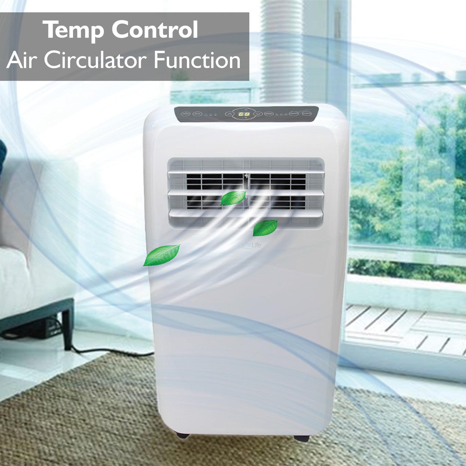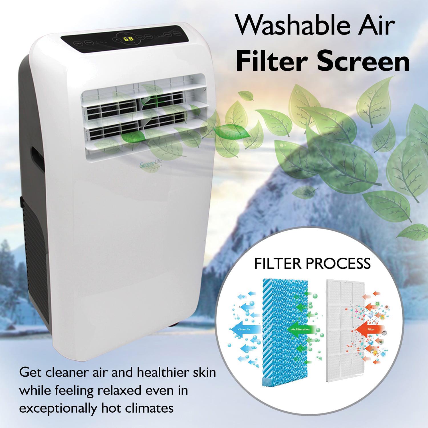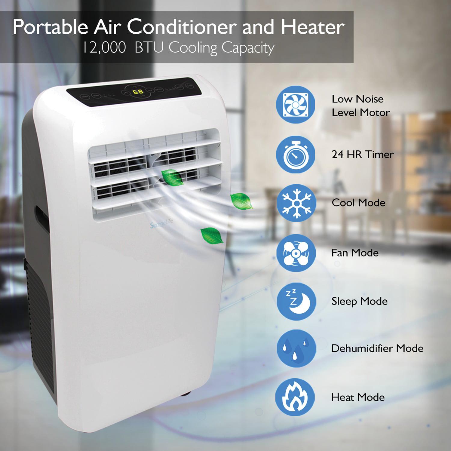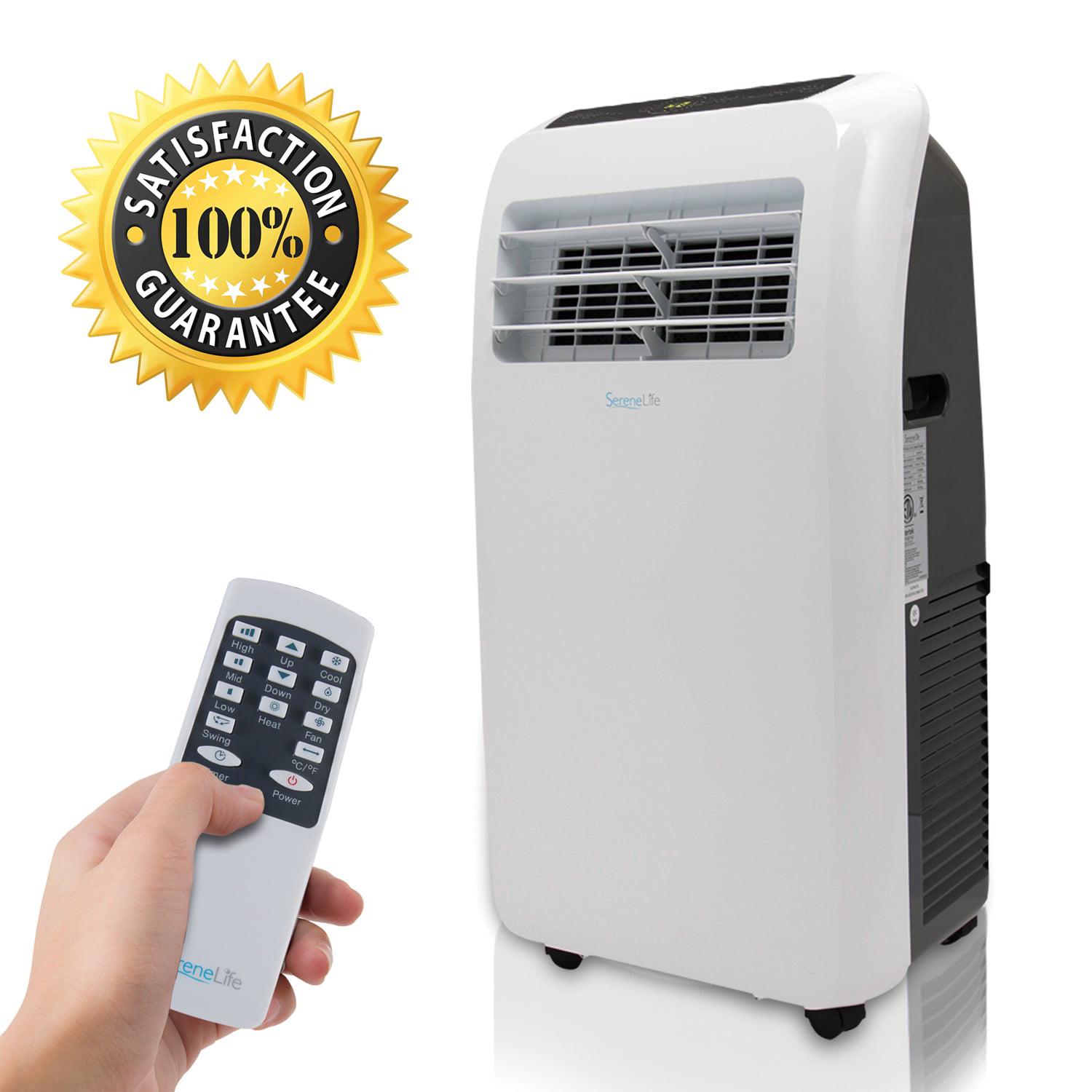 Get comfort any time of year with this 12,000 BTU Air Conditioner and Heater by SereneLife. This portable AC includes versatile heater and dehumidifying functions with temperature control, adjustable fan speeds, and even a window mounting kit for additional convenience. This portable fan has 12,000 BTUs of cooling and heating power with adjustable temperature control functions for customized comfort. Enjoy the dehumidifier function for those warm months, pumping up to 3.8 pints of water per hour with 3 fan speeds and moving vents to optimize airflow. Use the remote control for added convenience and easily move this room heater around with the attached wheels. To save space, this portable fan includes a window mount exhaust kit. Cool and heat rooms up to 325 square feet with this portable heater, designed with a low noise level and energy efficiency to save you money. With the multiple functions, adjustable controls, and convenient window kit option, this 12,000 BTU Air Conditioner and Heater by SereneLife has everything you need to stay cool and keep warm.