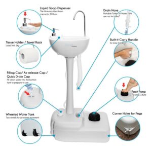 Keep your hands clean on camping trips and sports events with the compact and portable SereneLife Portable Hand Wash Sink Stand Water Faucet Washing Station. Featuring rugged and reliable construction, this hand washing stand can withstand years of use and is easy to assemble for on-site setup. The hands-free water dispenser activates via foot pump, making it easy to operate and provides 5 gallons of readily available water right when you need it. This faucet station also has built-in carry handle and rolling wheels for easy mobility and you can take it wherever you need it. This station also includes a integrated liquid soap dispenser and stainless steel towel holder for you to conveniently use soap beforehand and try your hands after. You can also fasten this sink stand to ground floors for extra stability The SereneLife Portable Hand Wash Sink Stand Water Faucet Washing Station is perfect for use in public areas, checkpoints, worksites, camping, and any outdoor activities