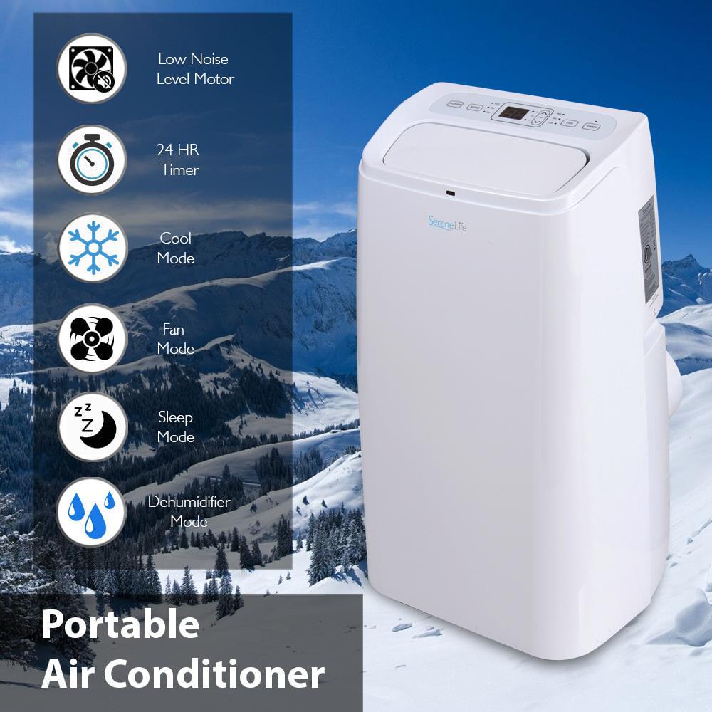 The SereneLife Portable Air Conditioner – Compact Home A/C Cooling Unit with Built-in Dehumidifier Fan Modes, Includes Window Mount Kit (12,000 BTU) – Lightweight Portable Cooling Power! – Hassle-Free, Quick Setup A/C Unit – Compact Room Air Conditioner – Automatic Air Swing Function – Simple Electric Plug-in Operation – (3) Operation Modes: AC Cooling/Dehumidifier/Fan – Automatic Swing Mode: Moving Wind Vents for Air Circulation – Includes Universal Window Mount Exhaust Kit – Removable Washable Air Filter Screen – Modern Style, Sleek Body Housing – Touch Button Control Panel – Time, Temperature Fan Speed Adjustment Settings – Convenient Climate Control in Rooms up to 325+ Square Feet – Energy Efficient: Low Power Consumption – Low Noise Level Motor.