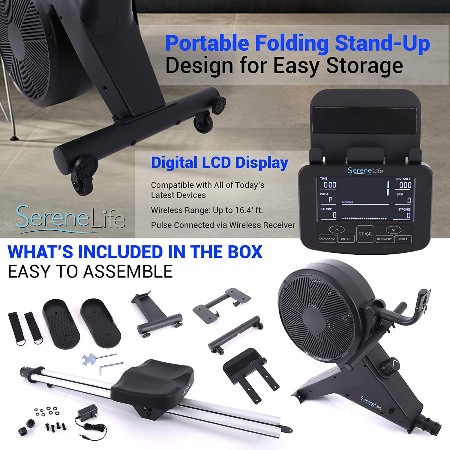 SereneLife Smart Fitness Rowing Machine Compact Gym Exercise Rower Style Get Connected with the ‘Fit Show’ App Pairs to Your Device via Bluetooth For Sports Training, Cardio Fitness, Weight Loss Fat Burning Measures Time, Distance, Strides, Calories Burned Digital LCD Display Computer Panel Adjustable Resistance Rower Level Setting Portable Folding Stand-Up Design for Easy Storage Quiet, Smooth-Gliding Padded Row Seat Comfortable Handlebar Grip and Pedal-Style Footrests Rugged Construction with Reinforced Handlebar Pull Cable Safety Certified Reliable & Lab Tested Auto Power-Off Battery Saving Function Perfect for Indoor Home & Office Gym.