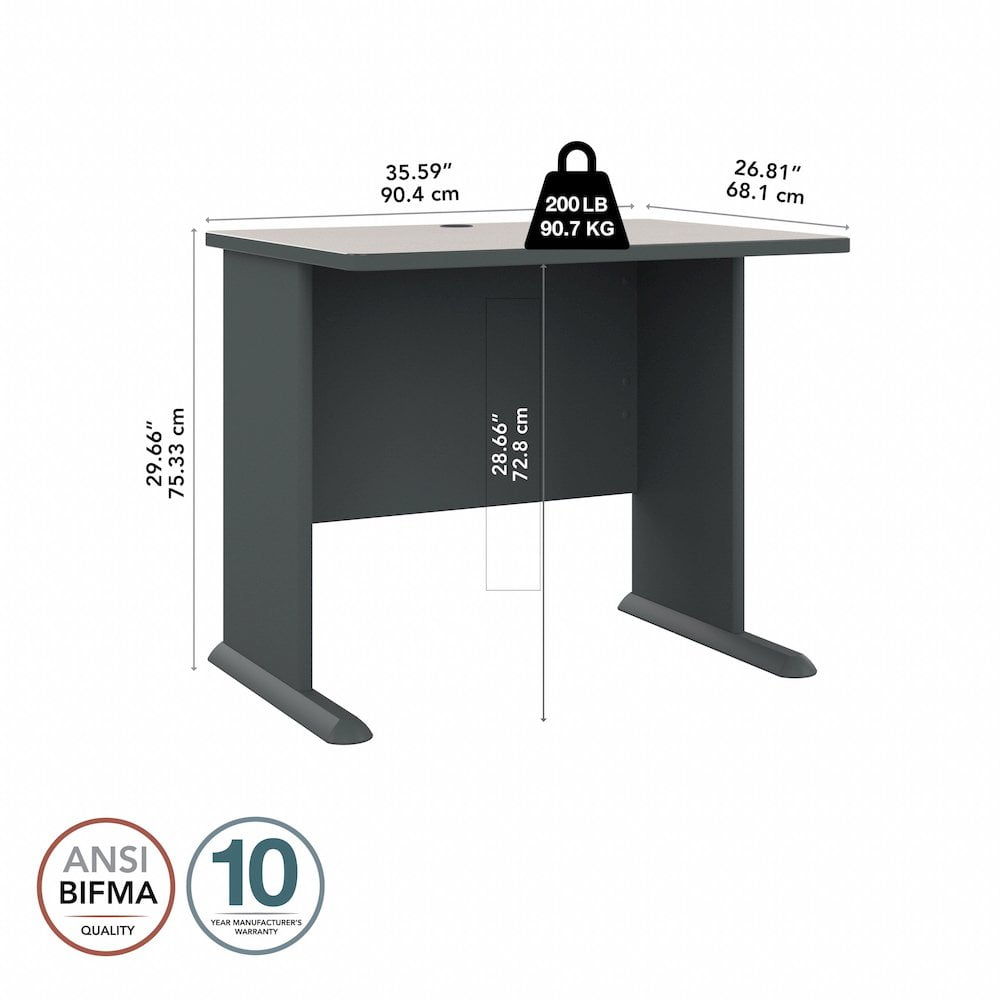 Small but strong, the Bush Business Furniture Series A 36W Desk fits in tight spaces and endures years of everyday use. Thick end panels and a durable thermally fused laminate surface fend off scratches, stains and dents for long-lasting professional quality. The comfortable C-Leg design offers loads of legroom, while wire management grommets organize and secure computer cables to keep them out of your way. Sturdy Desk feet include encapsulated steel armature and adjustable levelers for use on all types of flooring. Series A offers a variety of layout options and multiple two-tone finishes. Backed by a 10 Year Warranty. Features: Thermally fused laminate finish fends off scratches and stains Open C-Leg design provides loads of legroom; finished privacy panel allows the computer desk to look great facing any direction Desktop includes wire management grommets to neatly organize cords and cables Complete your workspace with a coordinating Hutch, Mobile File Cabinet, Keyboard Tray or Pencil Drawer (all sold separately) Thoughtfully designed for maximum stability and includes hardware to anchor the office desk to a wall Series A makes the most of any space with endless configuration options and multiple two-tone finishes to match your style Meets ANSI/BIFMA quality test standards for performance and safety Backed by the Bush Business Furniture 10 Year Manufacturer’s Warranty Specifications: Product Dimensions: 36W Desk: 35.59″W x 26.81″D x 29.66″H Product Weight: 59 lbs Product Color: Slate/White Material: Engineered Wood