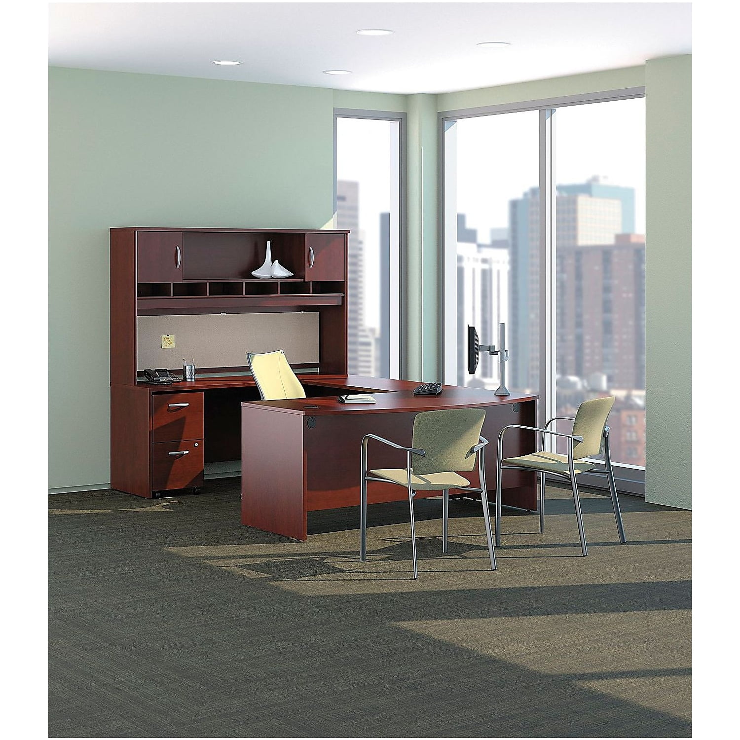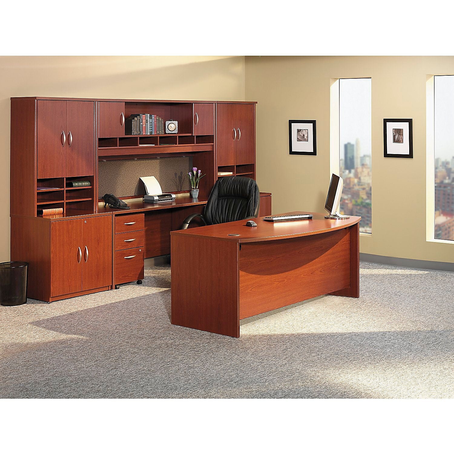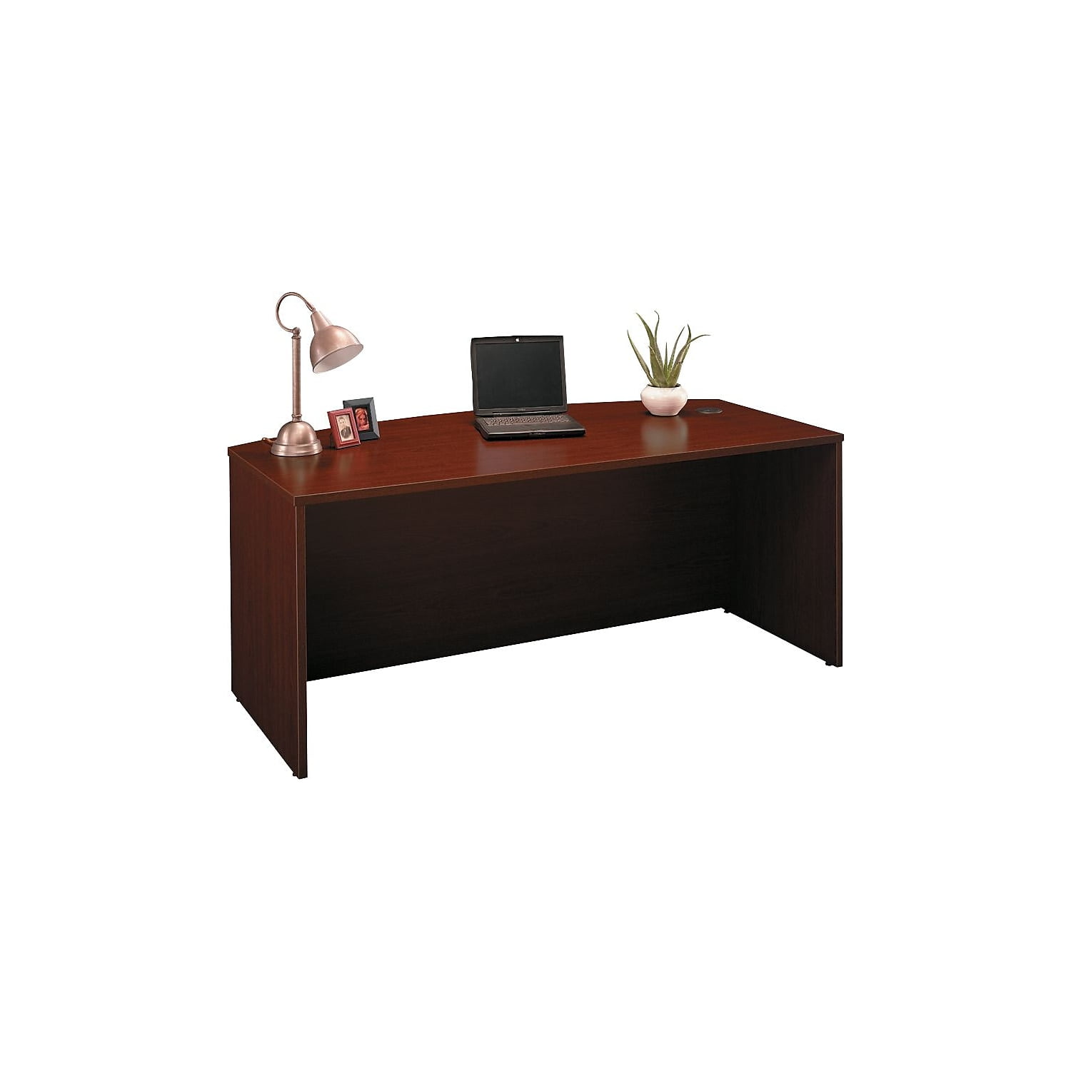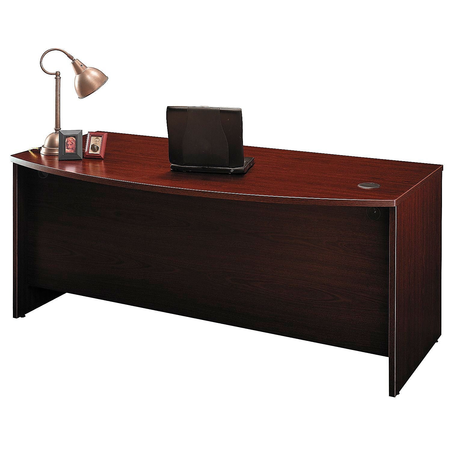 Spread out with all of your work on this Bush Business Furniture Series C Bow Front Desk and have space to spare for collaboration. The expansive 72W surface provides plenty of room for your laptop, phone and paperwork, along with wire management grommets to conceal cables. The rounded Bow Front Desk gives guests an extended workspace to pull up chairs and collaborate. Clean lines and extended modesty panels create a classic look, while a thermally fused laminate finish, thick end panels and rugged edge banding ensure long-lasting quality. Combine the Bow Front Desk with matching Series C products to form an L or U Shaped configuration, and add convenient accessories or storage items to complete your office. The options are endless with Series C. Backed by quality craftsmanship and a 10 Year Warranty, the collection withstands the rigors of a 40-plus hour week. Multiple layout options and 7 finishes meet the needs of numerous workspaces. Series C evolves with your preferences, allowing you to reconfigure your office as required with a complete line of coordinated products. Features: Finish: Mahogany Material: Thermally Fused Laminate Over Engineered Wood Thermally fused laminate work surface, rugged edge banding and sturdy end panels fend off scratches and damage Wide Desk surface offers space to spread out and integrated wire management to conceal your cables Inviting Bow Front Desk design offers extended rounded surface for guests to pull up chairs and collaborate Combines with matching Series C products to form L Shaped and U Shaped Desks Accepts Pedestals, Mobile File Cabinets, Pencil Drawer and Keyboard Tray (all sold separately) to complete your office Series C complements your office with clean lines, extended modesty panels and 7 finish options Meets ANSI/BIFMA quality test standards for performance and safety Assembled in the U.S.A. with U.S.A. & Imported Parts Specifications: Product Weight: 139 lbs Product Dimensions: 29.84″ H x 71.1″ W x 36.06″ D Product Color: Mahogany