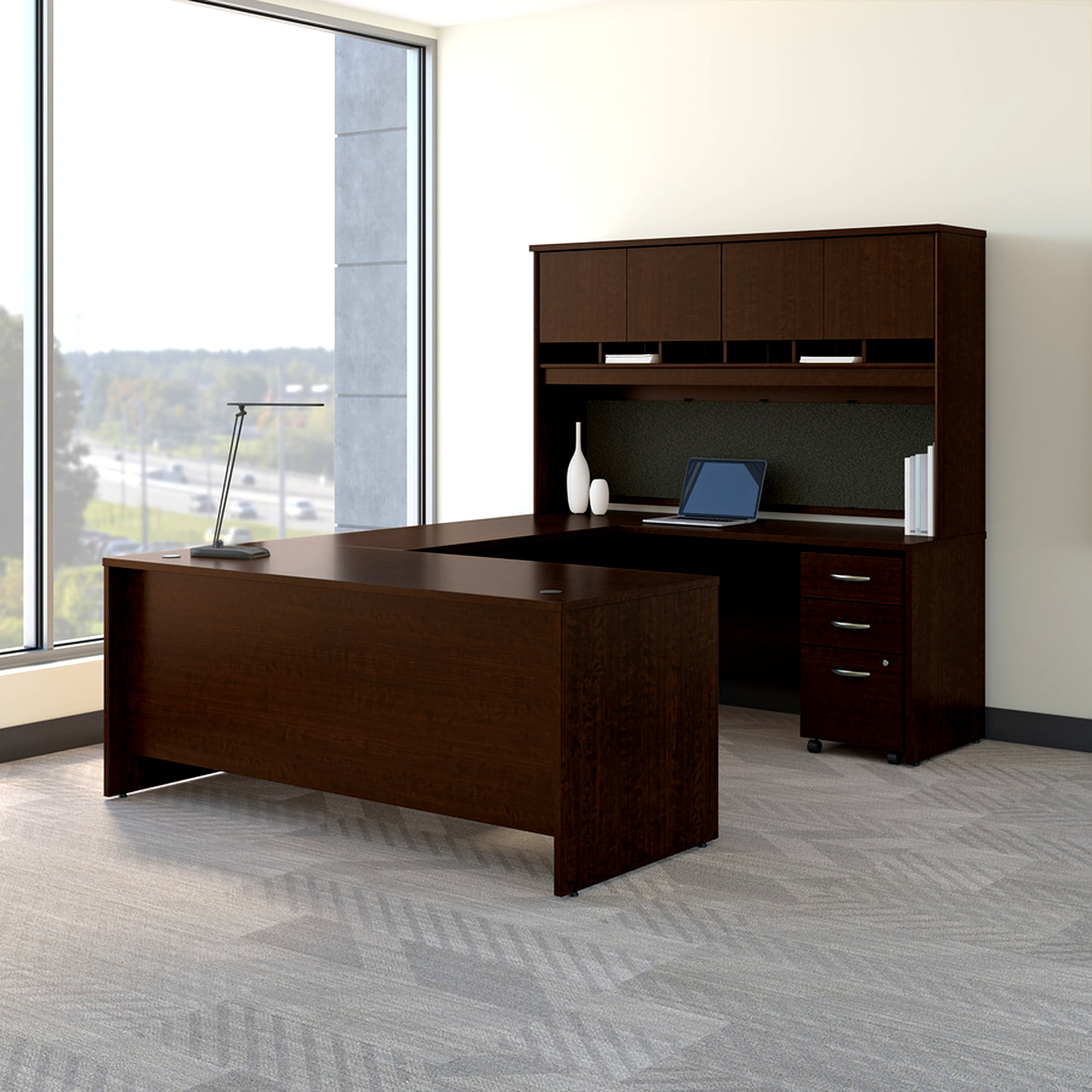 Finish: Mocha Cherry Material: Laminate Over Engineered Wood, Steel, Metal, Plastic, Thermally Fused Laminate Over Engineered Wood, Wood Thermally fused laminate work surface, rugged edge banding and sturdy end panels fend off scratches and damage Wide Desk surface offers space to spread out and integrated wire management to conceal your cables Accepts Return or Bridge on right or left side to form L or U Shaped configurations Use as a standalone Desk or expand your workspace with a 72W Hutch, Pedestals, Pencil Drawers and Keyboard Trays (all sold separately) Series C complements your office with clean lines, extended modesty panels and 7 finish options Meets ANSI/BIFMA quality test standards for performance and safety Assembled in the U.S.A. with U.S.A. & Imported Parts Commercial quality backed by 10 Year Warranty