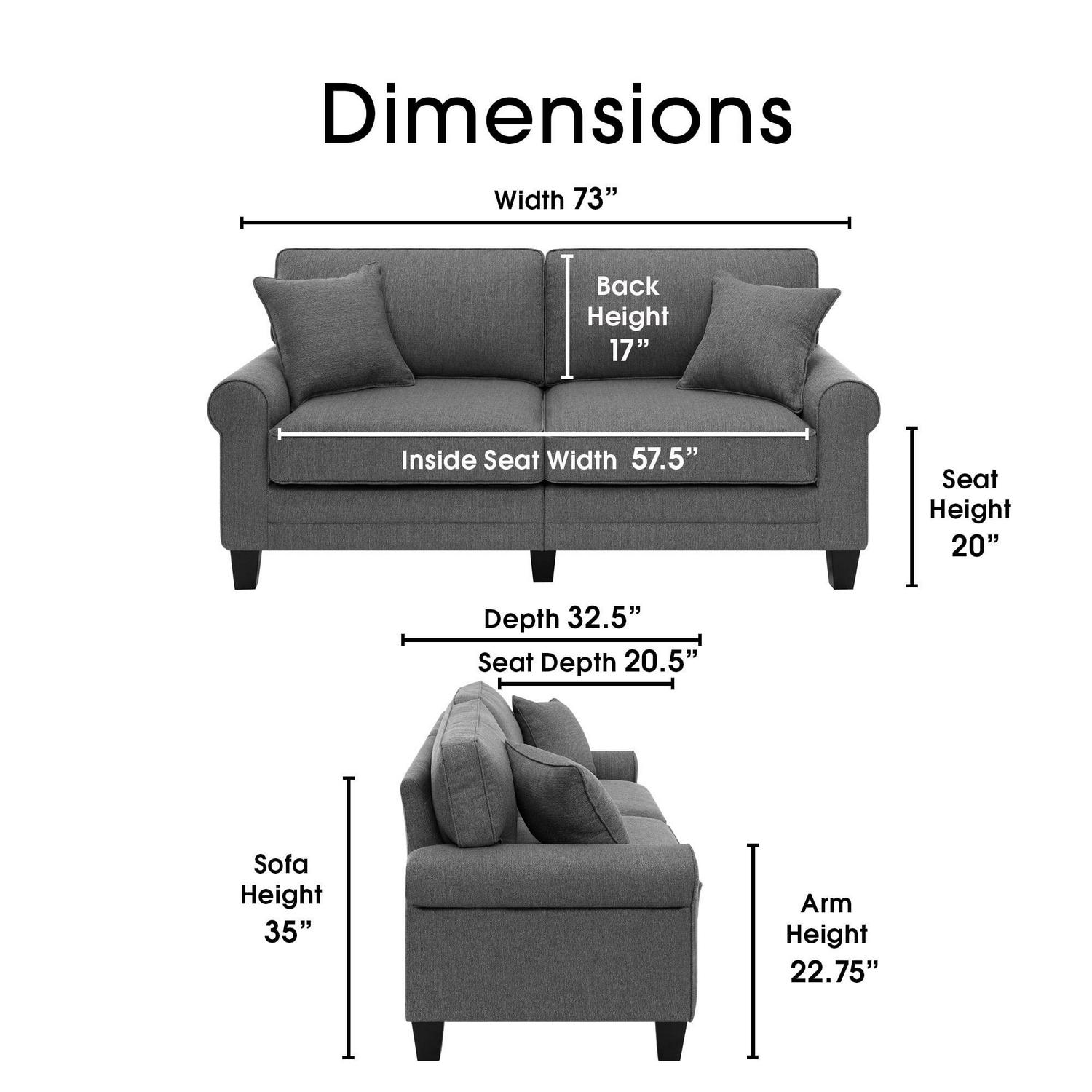 Upgrade your living space with the Serta Copenhagen Traditional Rolled Arm 73-inch Sofa. This cozy, two-seater couch fits comfortably in smaller living spaces, apartments, home offices, or dorm rooms. With soft fabric upholstery, it’s durable and easy to clean. Its wide seat cushions and individually wrapped coils surrounded by high-density foam and pillowed back cushions offer inviting support. Featuring rounded arms and straight-back cushions, this upholstered sofa has a timeless style that’s perfect for any living space. This versatile sofa can even be used as a sofa sleeper, and pairs perfectly with our selection of living room sofas and sofa sets. Whether you need a 3-seater sofa or a plush beige couch, upgrade your room furniture with the Serta Copenhagen Traditional Rolled Arm 73-inch Sofa.