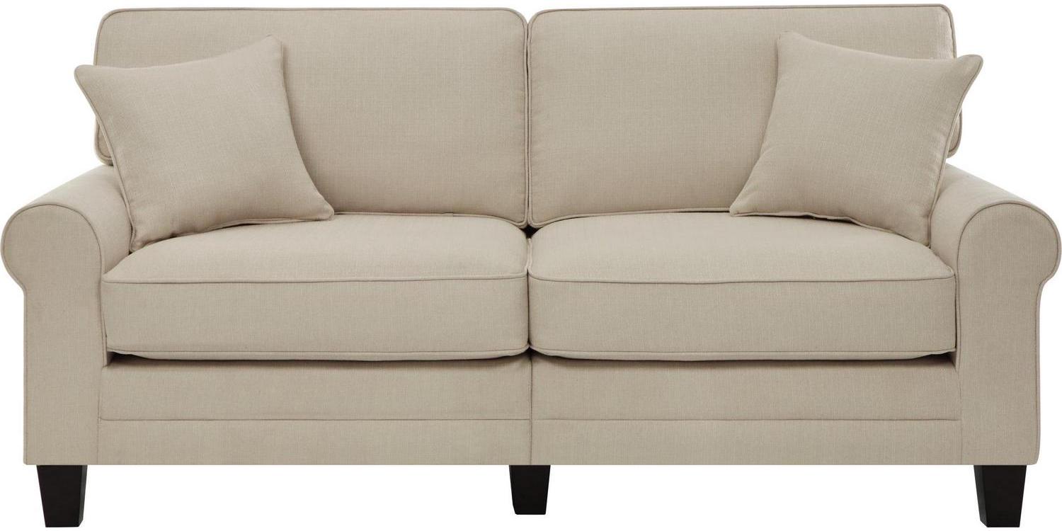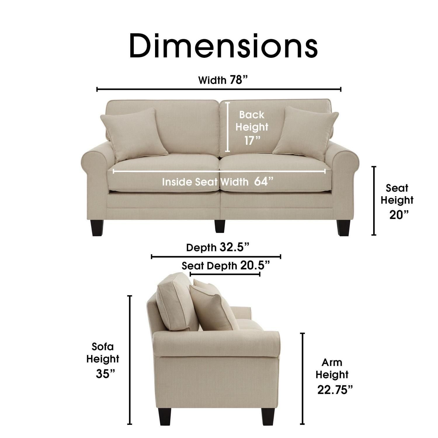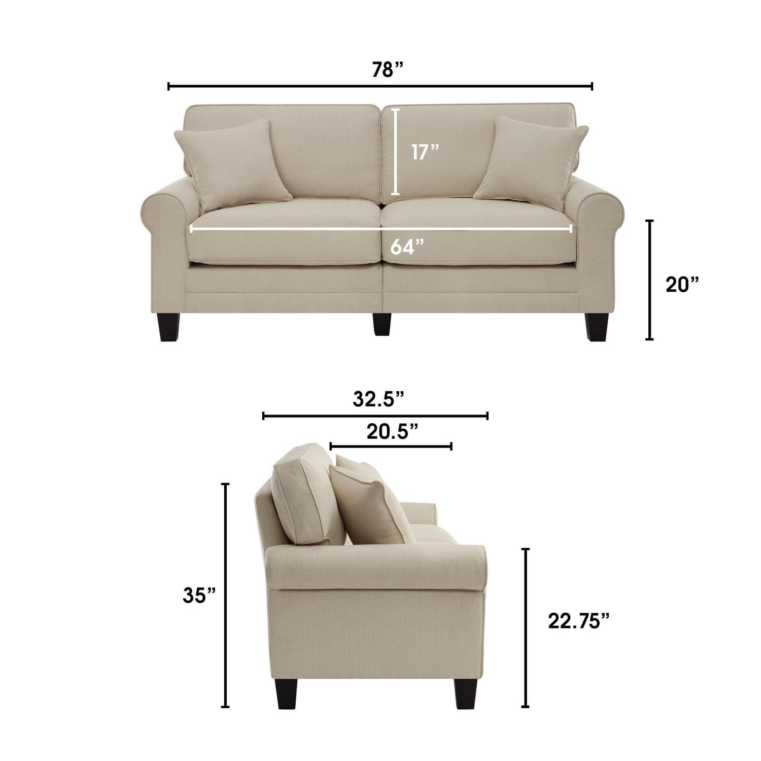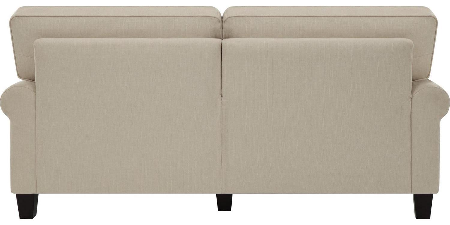 Make your living room an inviting space with this comfortable and versatile sofa. Easy to clean and soft to touch, this cozy three-person couch is upholstered with durable fabric to ensure it stays looking and feeling great. This 78 inch wide sofa is a great fit for smaller living spaces, apartments, or in a home office. This cozy couch has a wide seat that features premium cushions made with individually wrapped coils surrounded by high-density foam. The durable fabric upholstery and removable pillow-back cushions make for easy cleaning, perfect for busy families. Choose from a variety of color and material options to match your decor. Featuring rounded arms and straight-back cushions, this upholstered sofa has a timeless style that s sure to feel at home in any living space. Serta Copenhagen Traditional Rolled Arm 78-inch Sofa, Buckwheat Beige Fabric