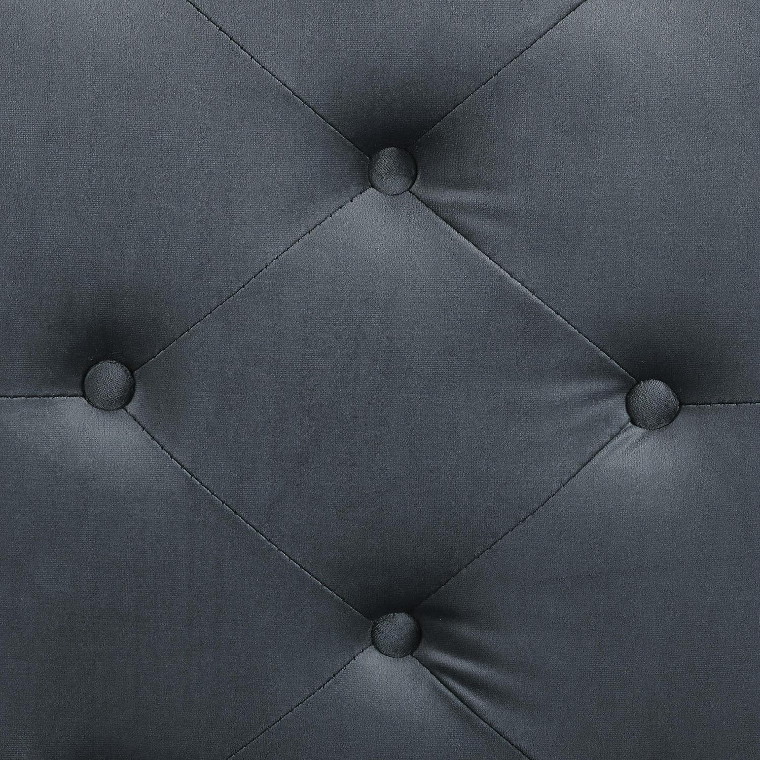 Tufted upholstered fabric in a sophisticated color palate Cushioned seating for comfort and support First class design and construction make this piece a stunning addition to any room Classy and contemporary – low profile with iron legs and frame Tools included for easy assembly