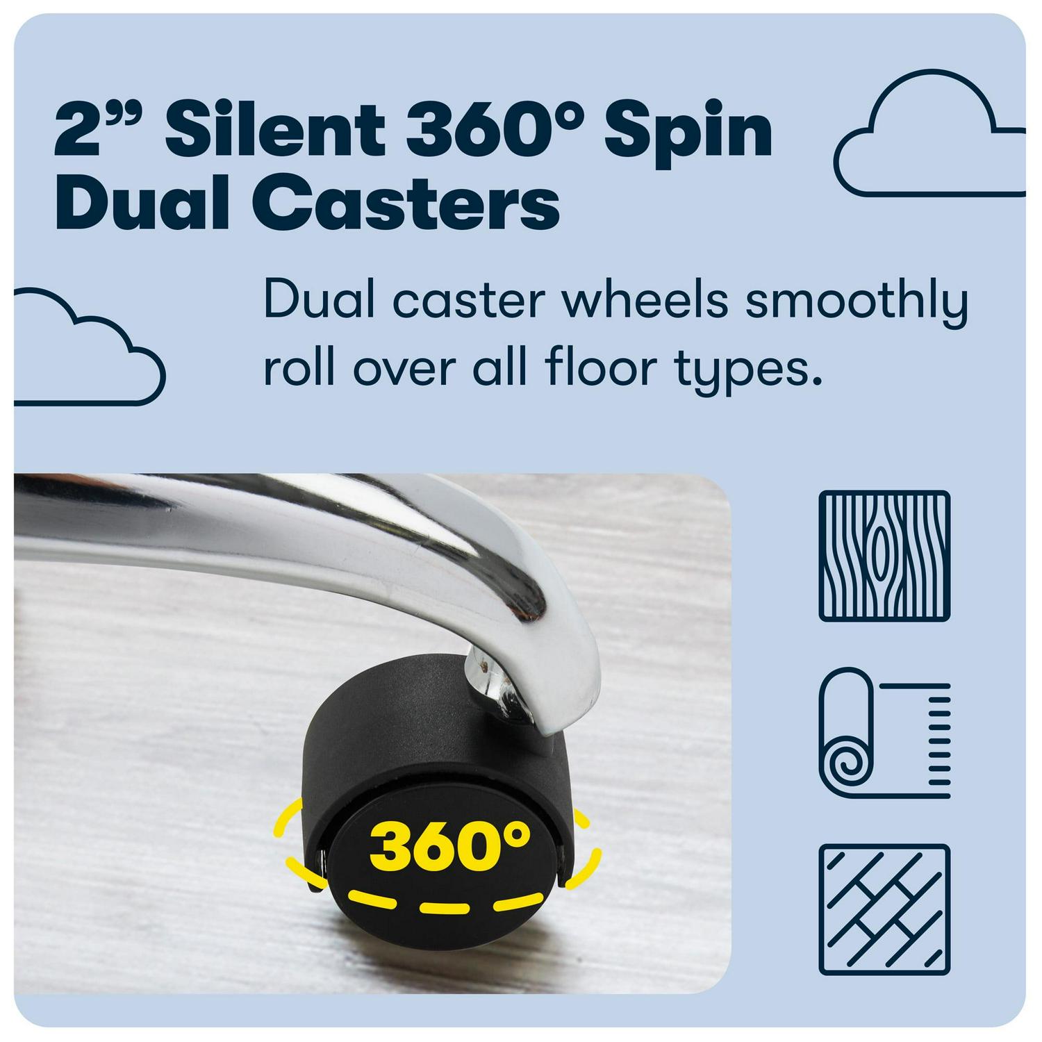 – Silent 360-degree spin, smooth rolling, dual caster wheels (not recommended for wood or tile flooring without mat)