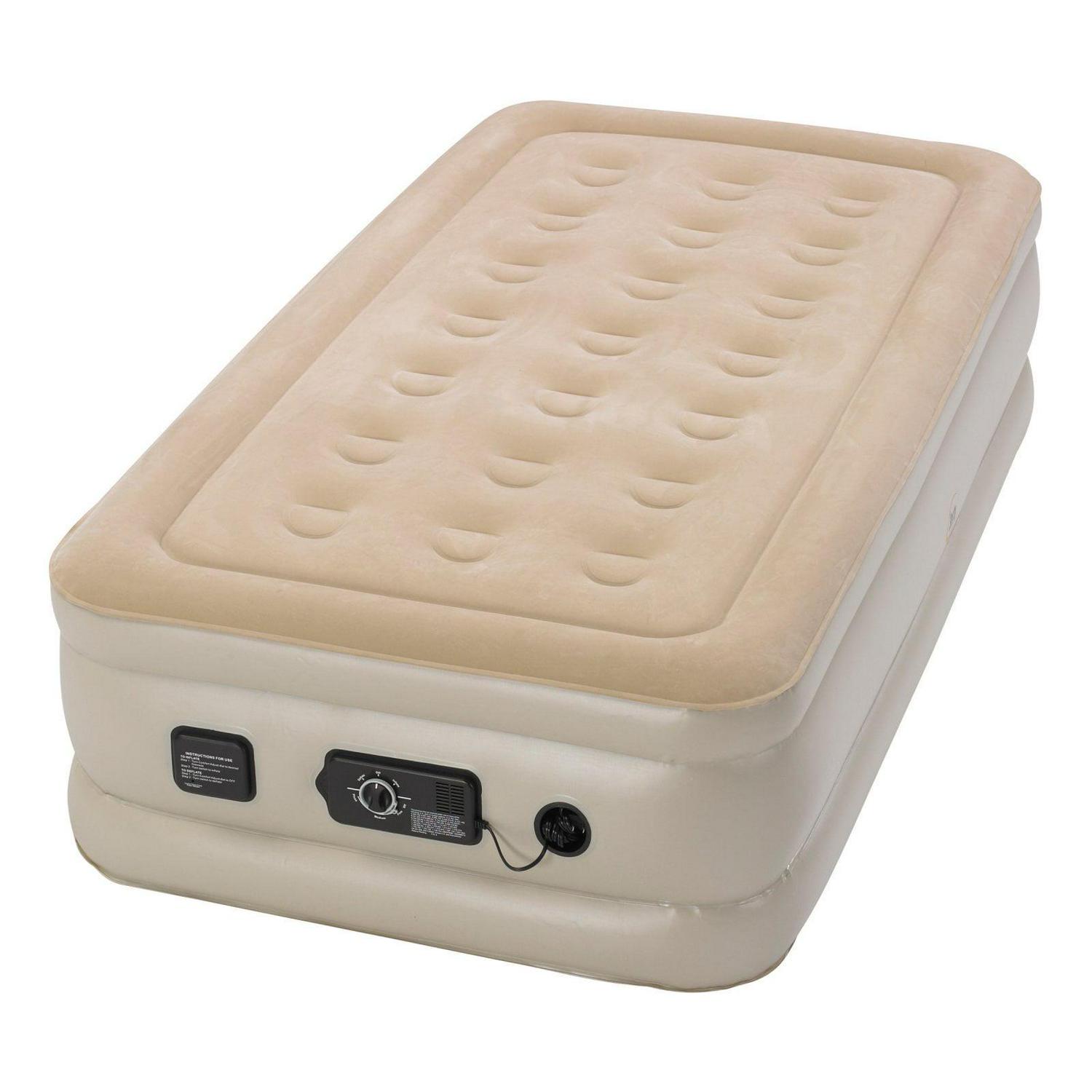 Enjoy camping or accommodate overnight guests easily with the Serta Raised Air Bed with NeverFlat AC Pump. Offering versatility, portability, and soft, cozy comfort, this inflatable mattress lets you transform any room in your home into a spare sleeping area. Ideal for kids’ sleepovers, holiday guests, and more, this air bed with a pump features an innovative sensor that monitors air pressure on a continuous basis. Whenever a loss of volume happens, a silent, secondary pumping mechanism engages instantly, plumping the mattress in order to maintain consistent firmness and prevent discomfort. This queen-size inflatable air bed features a raised height that allows sleepers to get in and out easily. With a flocked top, it can be dressed up with sheets, blankets, and pillows to ensure guests stay comfortable. With its on-board NeverFlat AC pump, the Serta Raised Air Bed is suitable for use while camping in a recreational vehicle or at a tent site equipped with electrical outlets. A carry bag is included, making storage and transport simple and protecting the mattress when it is not in use. This innovative inflatable air bed inflates and deflates quickly for added convenience. Whether you need a good night of rest or a quick little cat nap, this queen-sized air mattress sleeping pad will be the perfect addition to your bed frame.