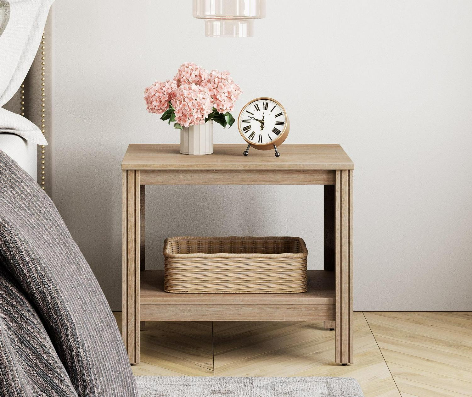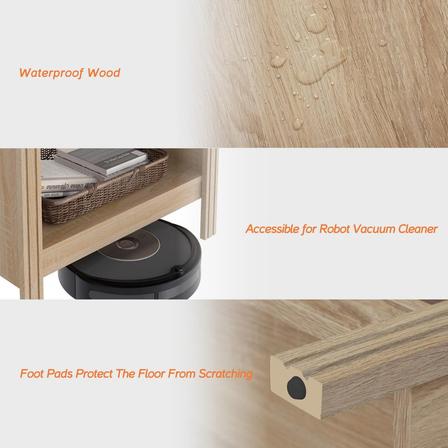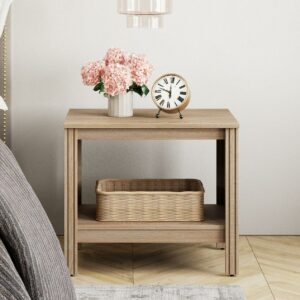 Note: The 2 piece side tables are shipped in two packages, so you may receive two packages at different times.Delicate oak wood grain design make this small nightstand more chic and unique, adding more elegance to your room. Overall dimension: 23.6″×15.5″×20.6″(L×W×H). In addition to a end table, it can also be used as a nightstand, bed bench,entry table and plant stand.Feature 1 storage shelves Made of superior thick boards, the wooden bedside tables are durable and sturdy enough to be used for a long time.Weight Capacity: 80 lbs.