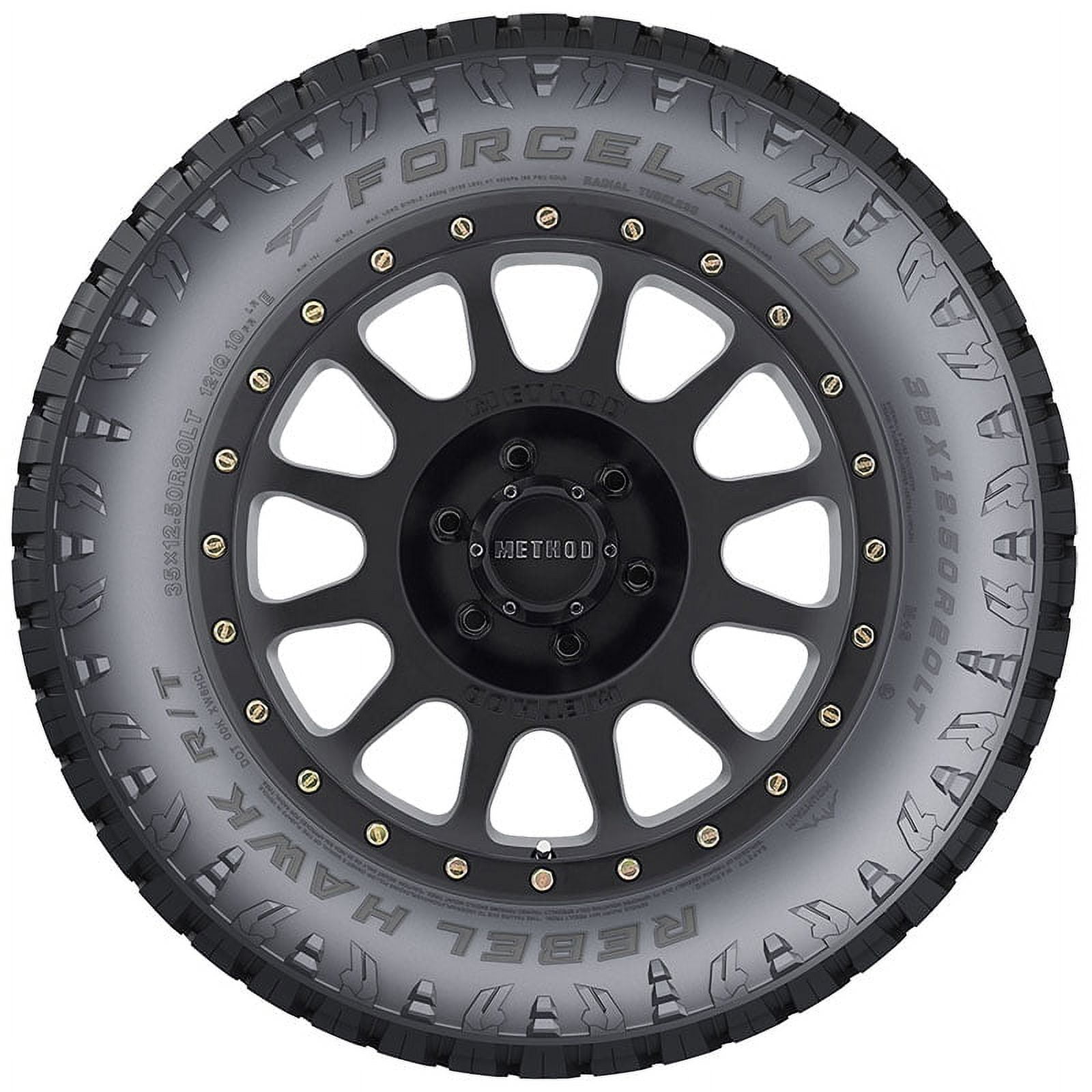 An all terrain tire, the Forceland Rebel Hawk R/T is designed for use on Jeeps, light trucks, and SUVs that want balanced performance on and off road. The Rebel Hawk R/T features strong shoulders that improve traction and performance on tough off road terrains, and an optimized design that reduces noise and vibrations on paved roads for a quiet, comfortable ride.