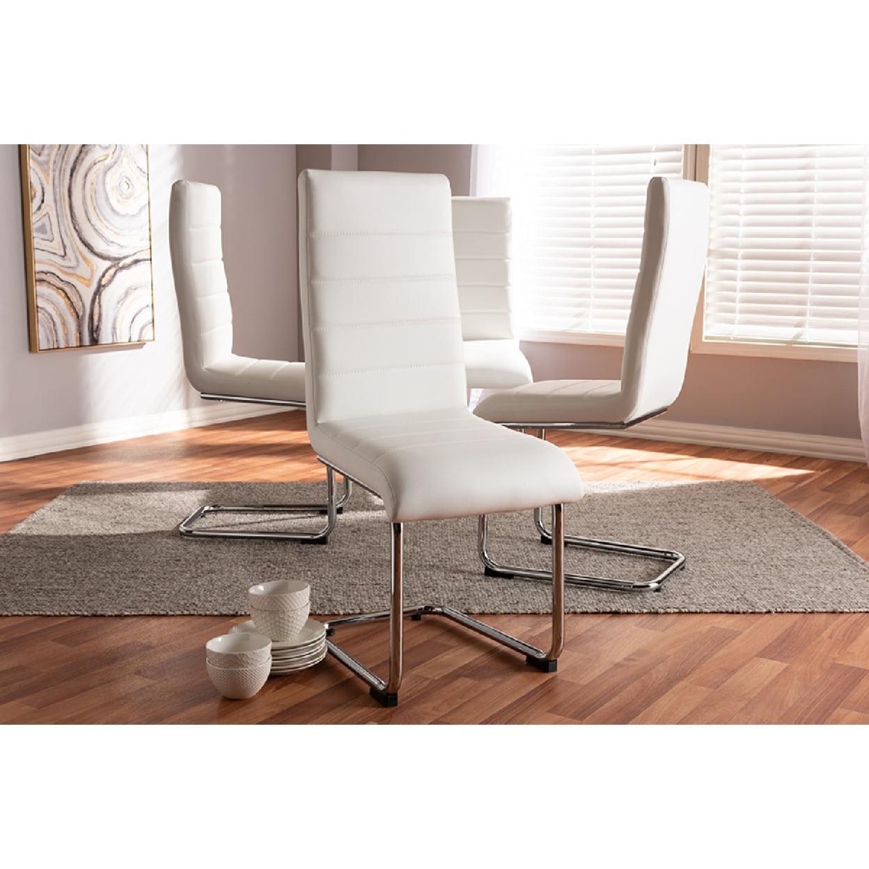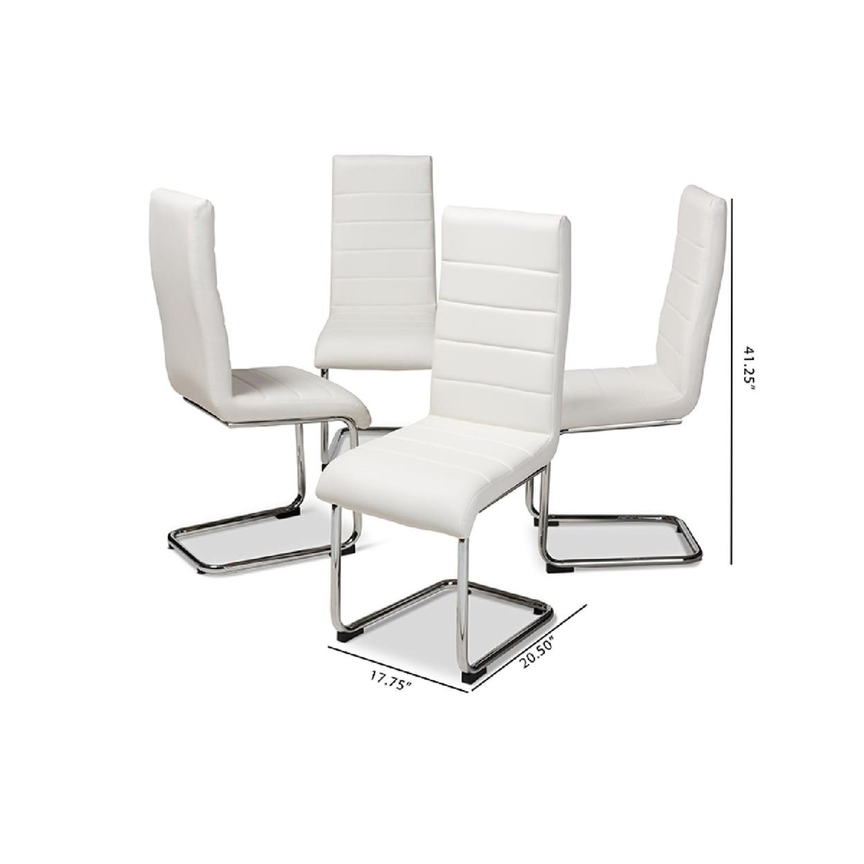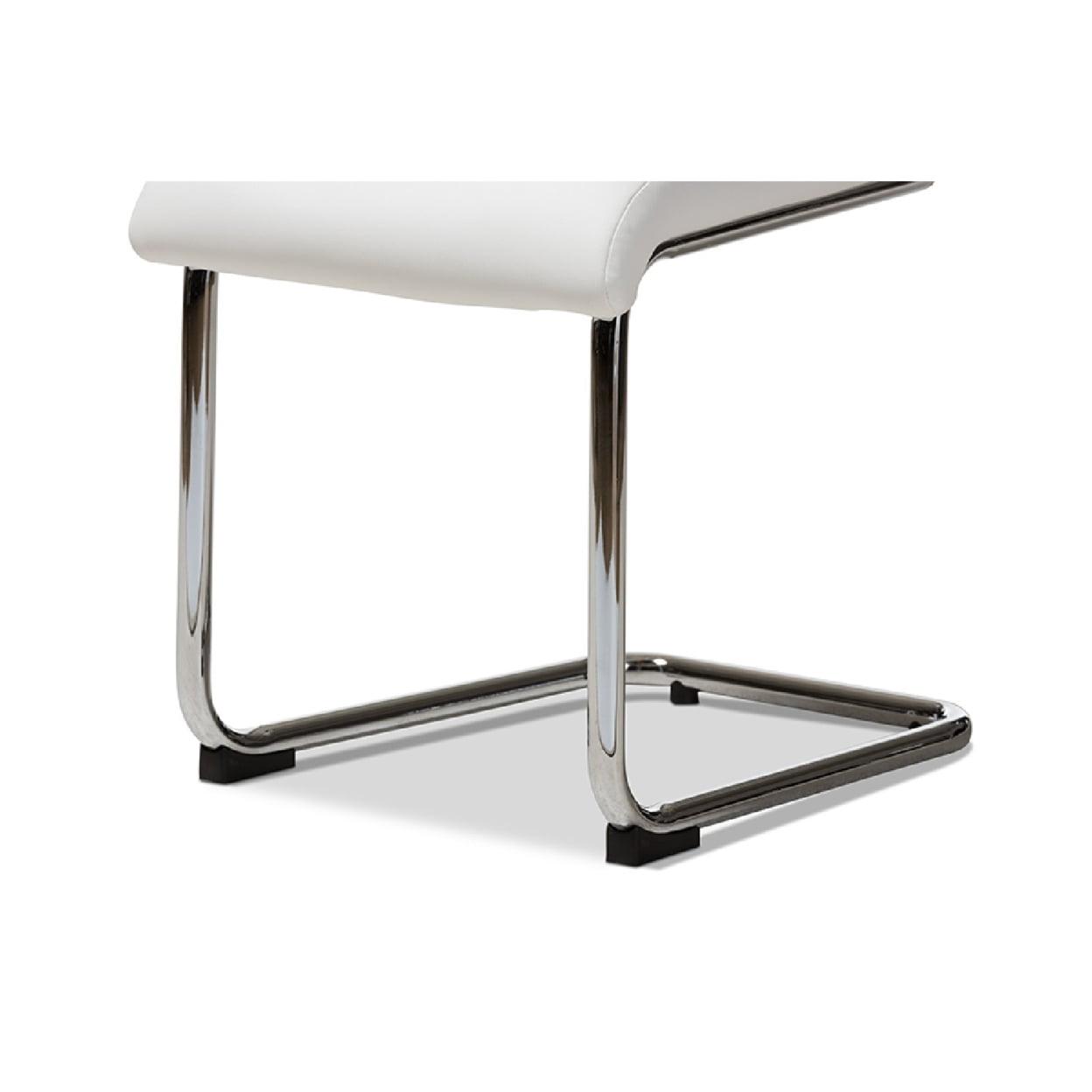 White faux leather upholstery. Chrome finished metal legs. Gently curved chair back.