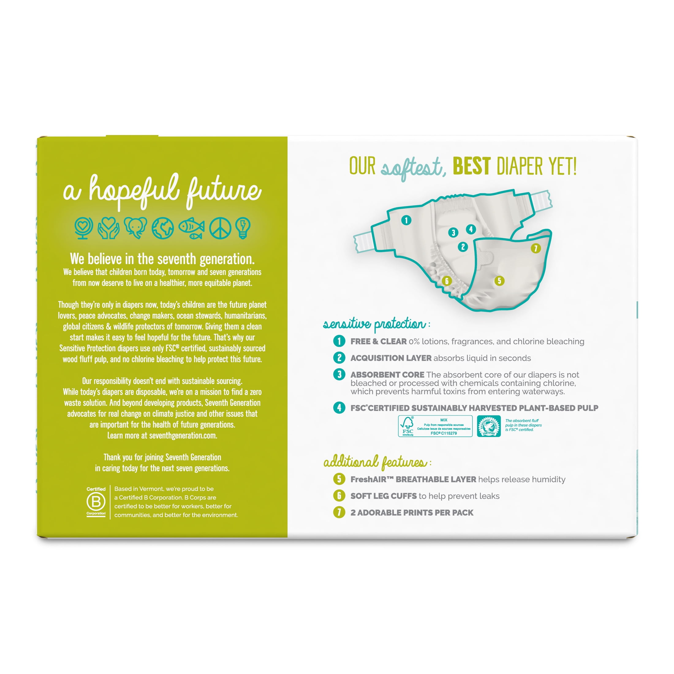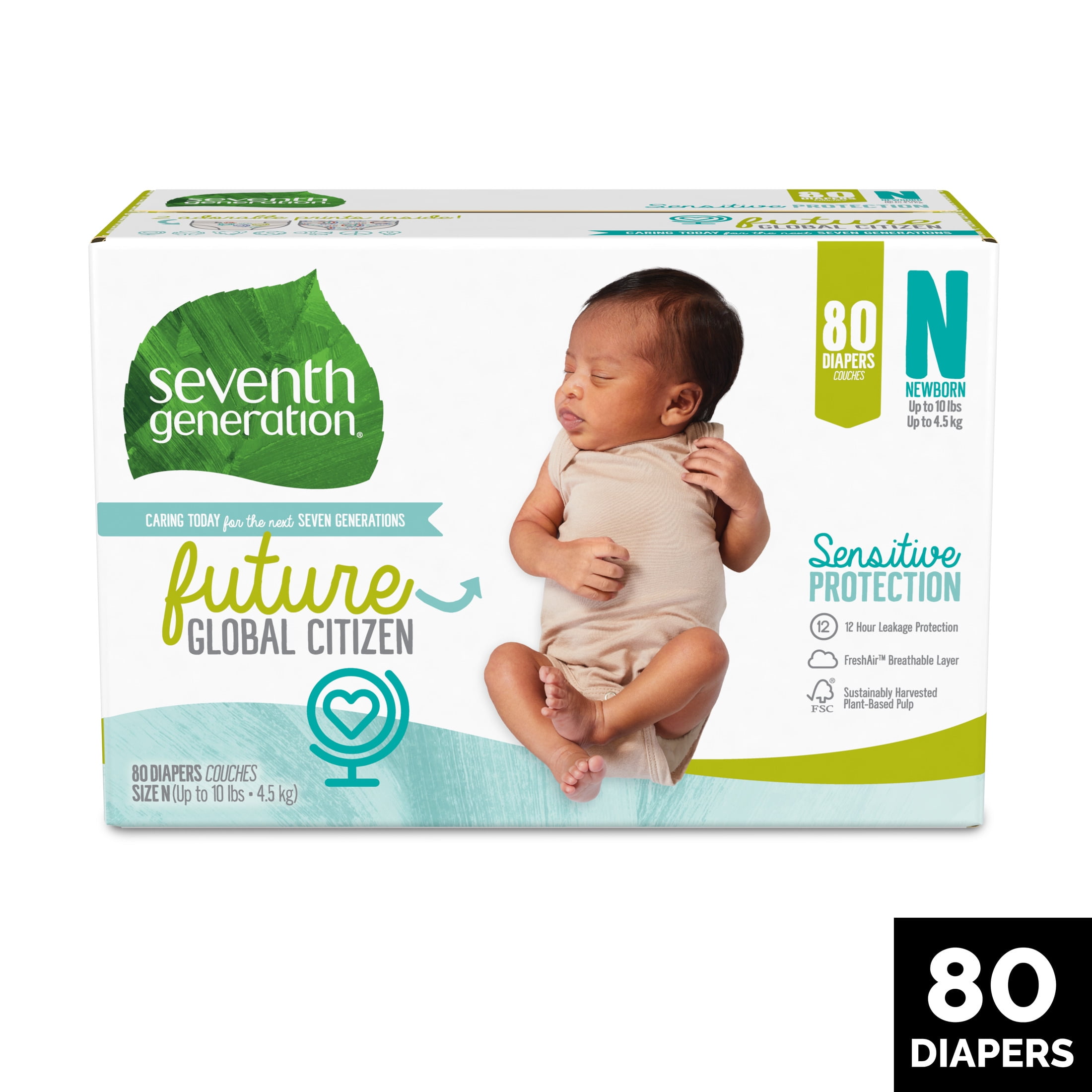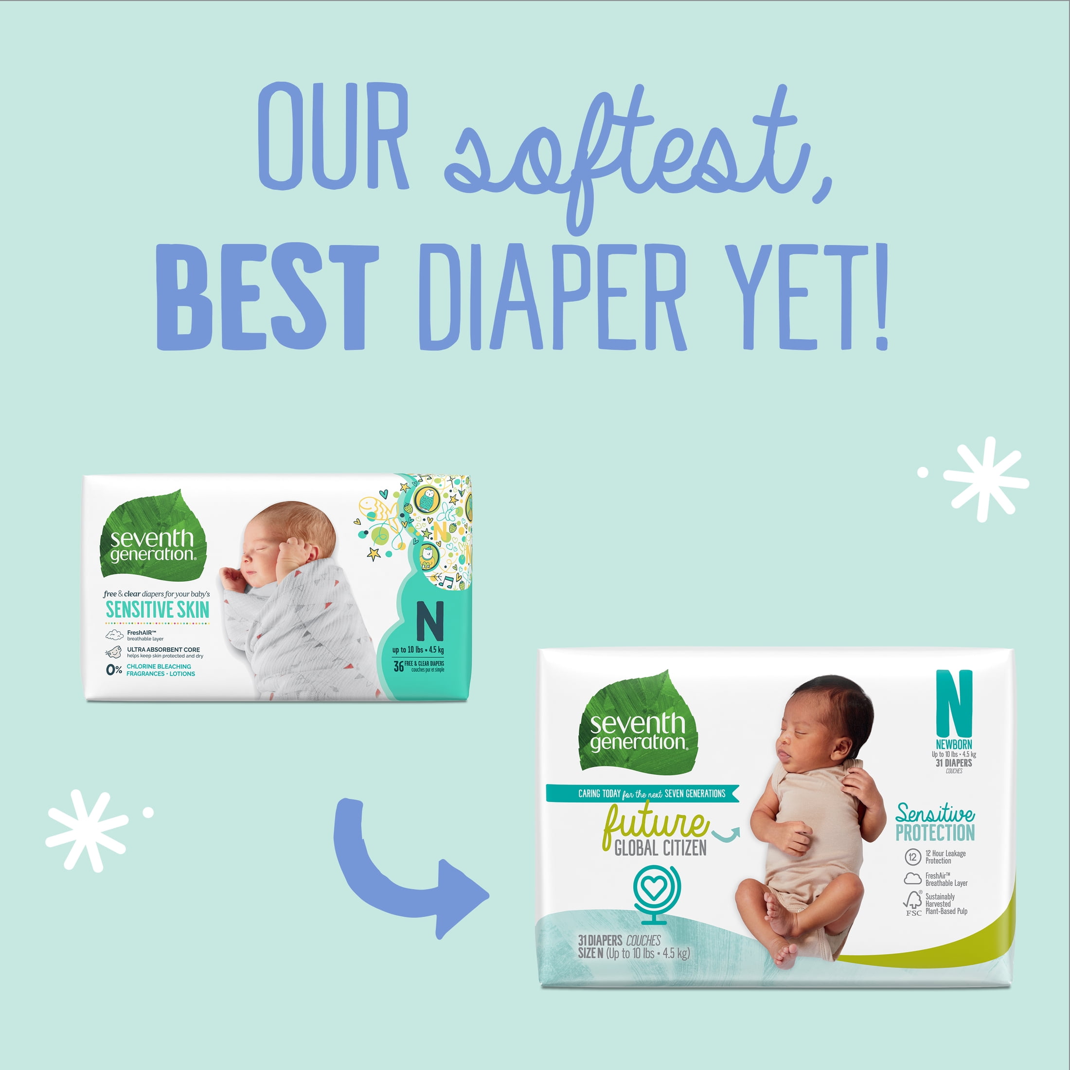 A dry baby is a happy baby, and our size Newborn diapers provide the 12-hour protection that keeps those smiles coming The absorbent core in our diaper size Newborn is not bleached or processed with chemicals containing chlorine, which prevents harmful toxins from entering waterways Our Seventh Generation Baby Diapers FreshAIR Breathable Layer helps release humidity and pulls moisture away from baby’s skin Seventh Generation Free & Clear with 0% Lotions, or Chlorine Bleaching, and fragrance free diapers Our Seventh Generation Diapers Chlorine Free are made using only FSC Certified, sustainably sourced plant-based pulp, which helps nurture our planet’s forests 80 count Baby Diapers Newborn Seventh Generation