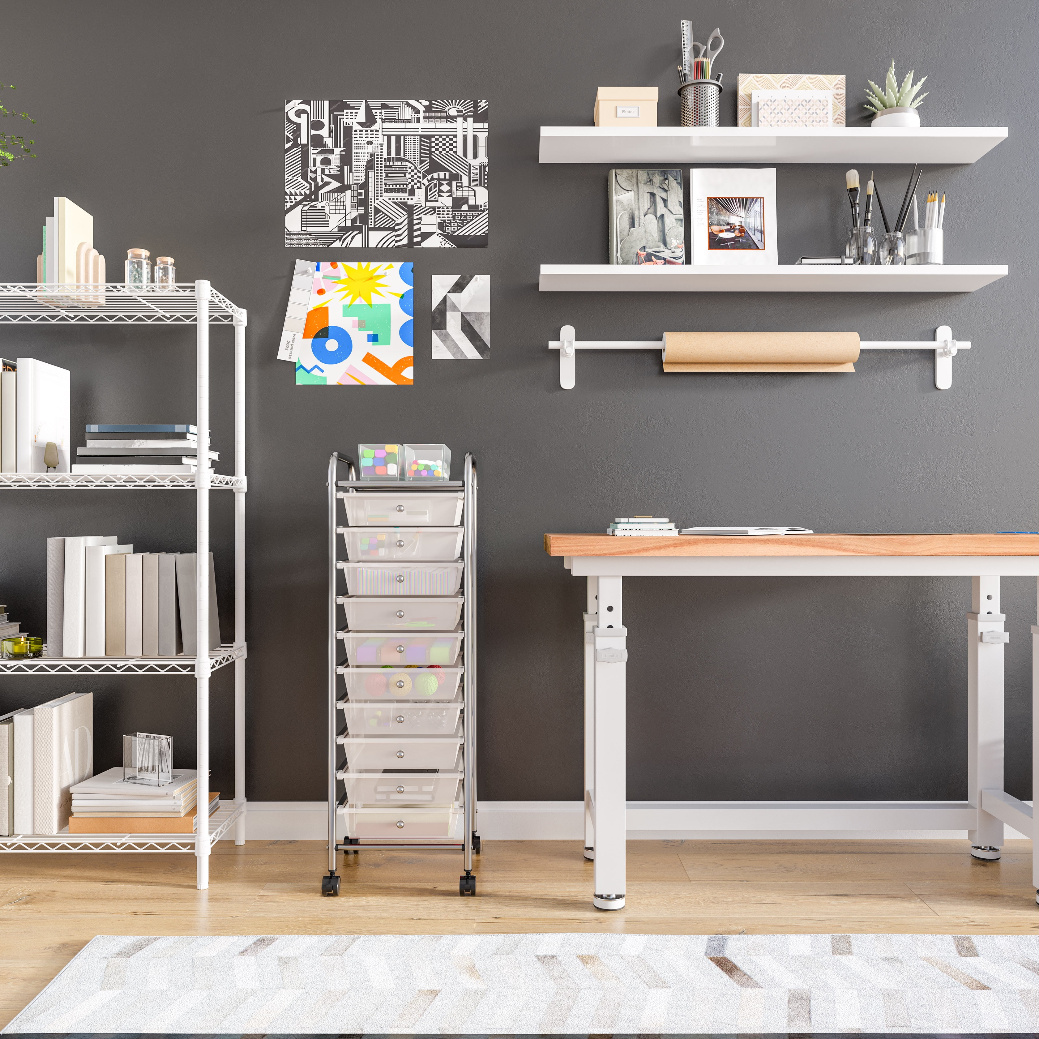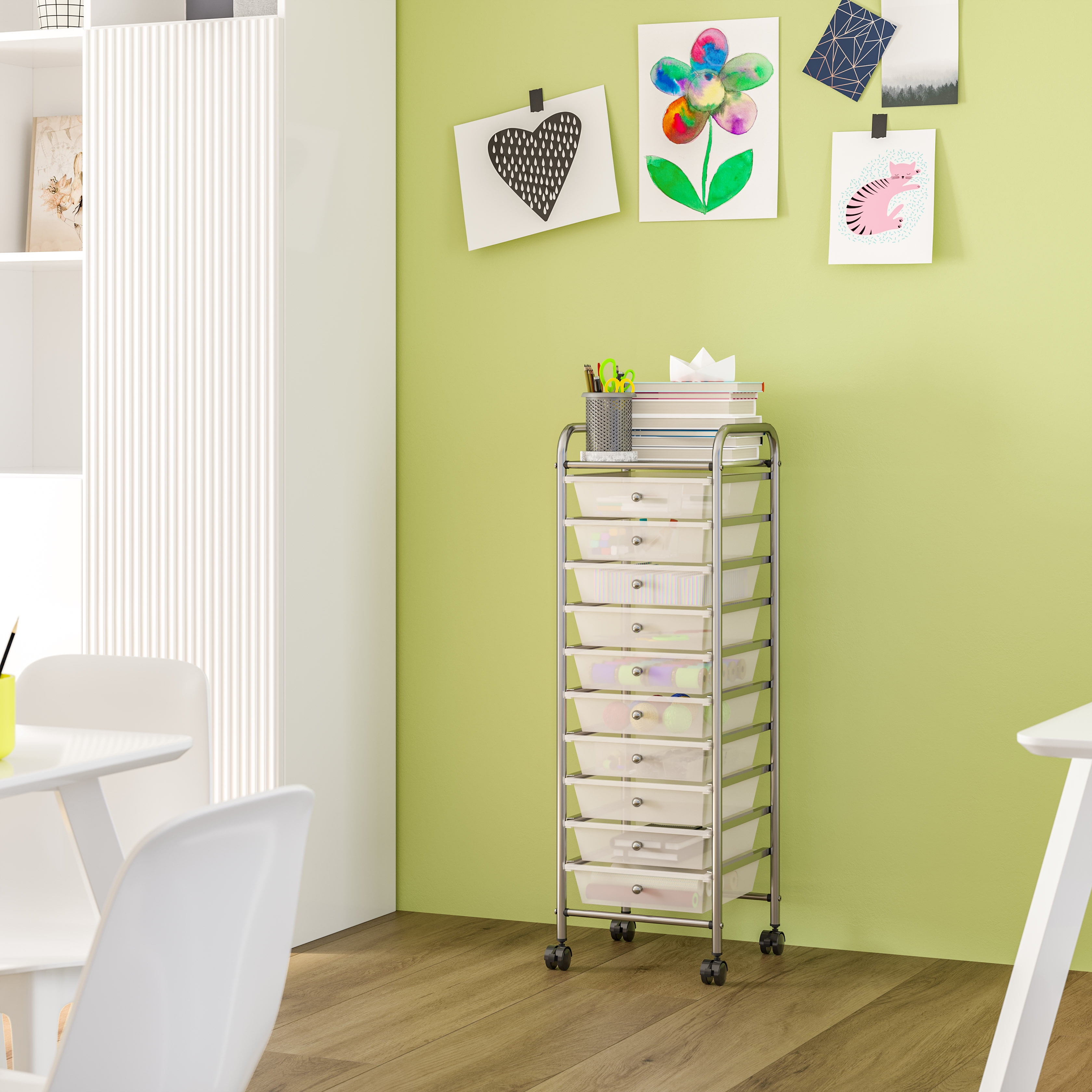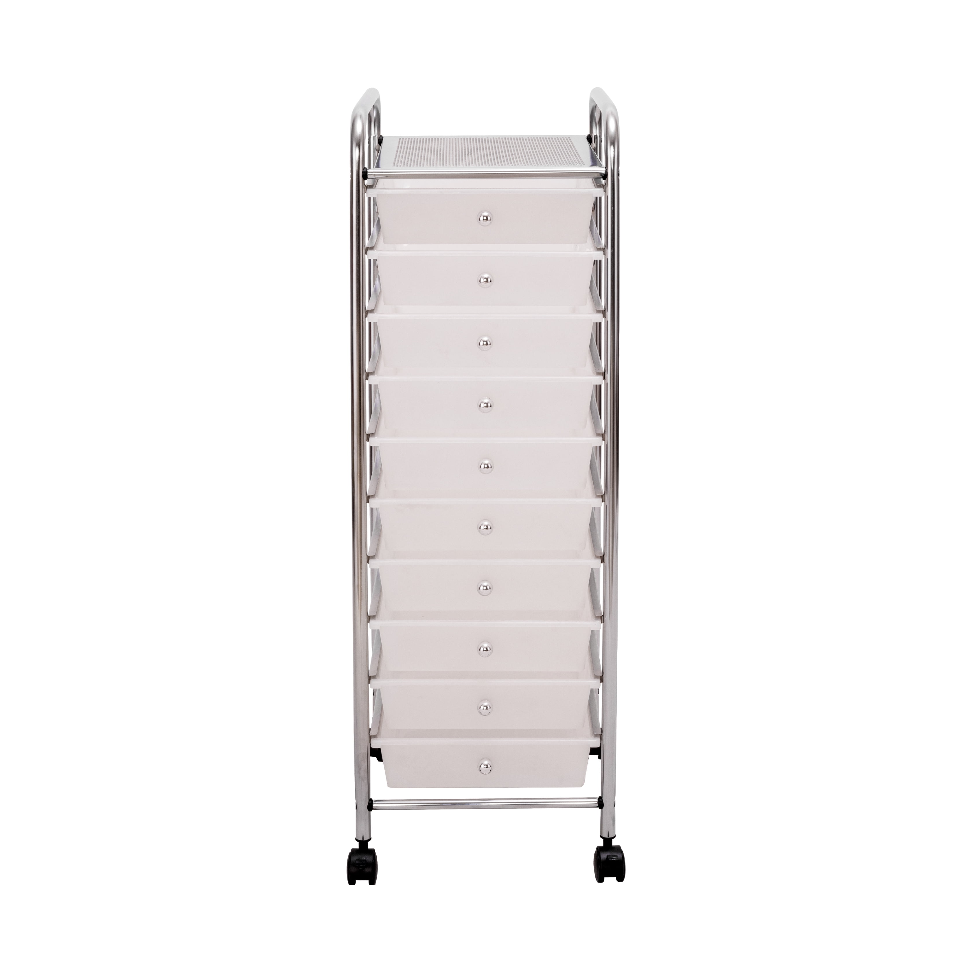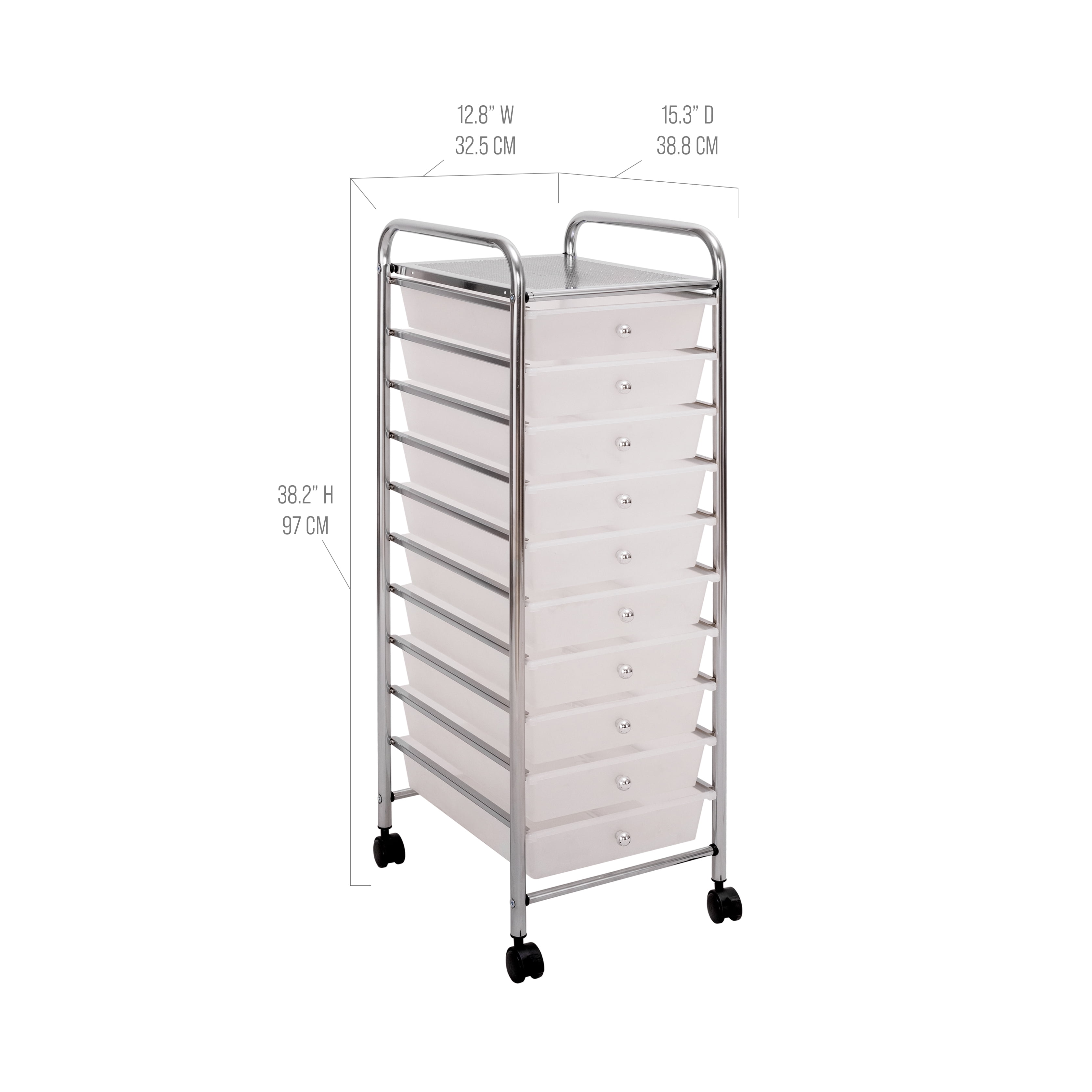 PURE ORGANIZATION – 10 drawers provide plenty of space for keeping your home office supplies tidy and close, organizing makeup and cosmetics, storing arts and crafts supplies, and arranging tools for use in the garage ORGANIZER DIMENSIONS – 15.5″ W x 15.4″ D x 38.2″ H; inner drawer dimensions: 12.5″ W x 14.0″ D x 2.5″ H TRANSLUCENT FINISH – Semi-transparent polypropylene drawers in frosted white allow you to determine if a drawer is empty at a glance REMOVABLE DRAWERS – Easy to install and easy to remove, the drawers slide unattached through metal channels. Take your stuff with you when you need it MOBILE STORAGE SOLUTION – Four casters (two locking) allow the cart to go where you need; tall handles make it easy to push and pull